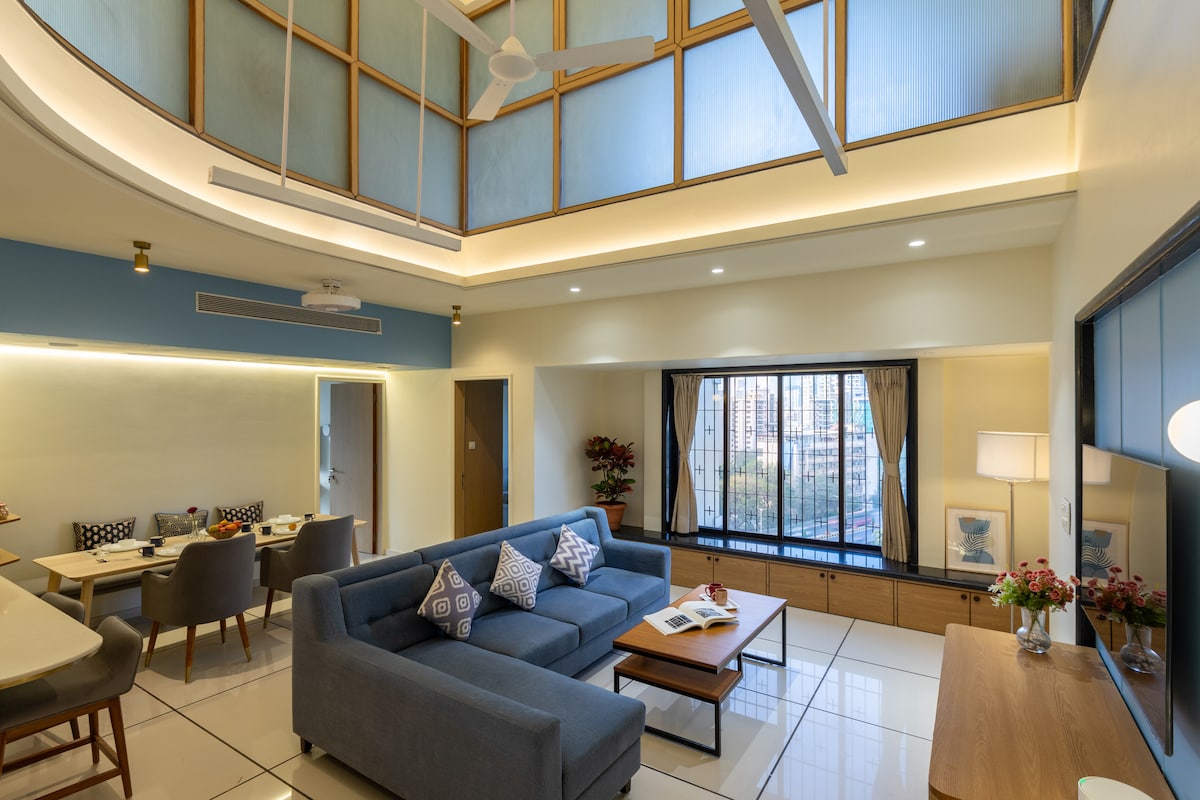 Forget your worries in this spacious and serene space. A home away from home, in a peaceful locality with earthy art-decor, sheesham wood furniture and warm lighting. This is a boutique service apartment, centrally located in Khar West. It has 4 private bedrooms, and common spaces include a large living room with dining, a powder room, and a fully-equipped kitchen with a refrigerator, oven, microwave, hob, kettle, toaster and a washing machine. Hosted by Grace Ohana Homes