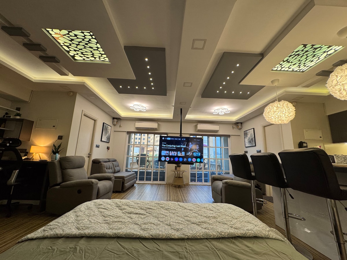 Experience luxury living at its finest in our Top-Floor Luxury Apartment with Projector. One of the highlights of our space is the state-of-the-art projector screen, offering an immersive viewing experience like no other. Whether you're catching up on your favorite movies or hosting a movie night with friends, the larger-than-life screen will transport you into another world. Step out onto our balcony and be prepared to be mesmerized by the scenic views stretching as far as the eye can see.