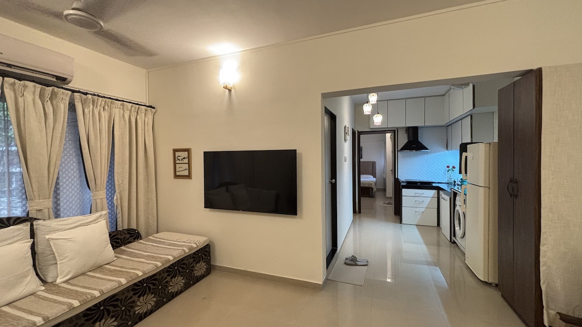 A Quite self-contained 1 BHK apartment, walking distance to the Carter Road seafront. Situated on a winding street, close to Yoga house and numerous charming eateries. - 550 sqft 1st floor apartment with lift access - perfect for work/leisure - In-unit washing machine - 42" Smart TV - Hi-speed Wi-Fi - 24/7 security + CCTV - Dedicated parking - Airport ride available on request