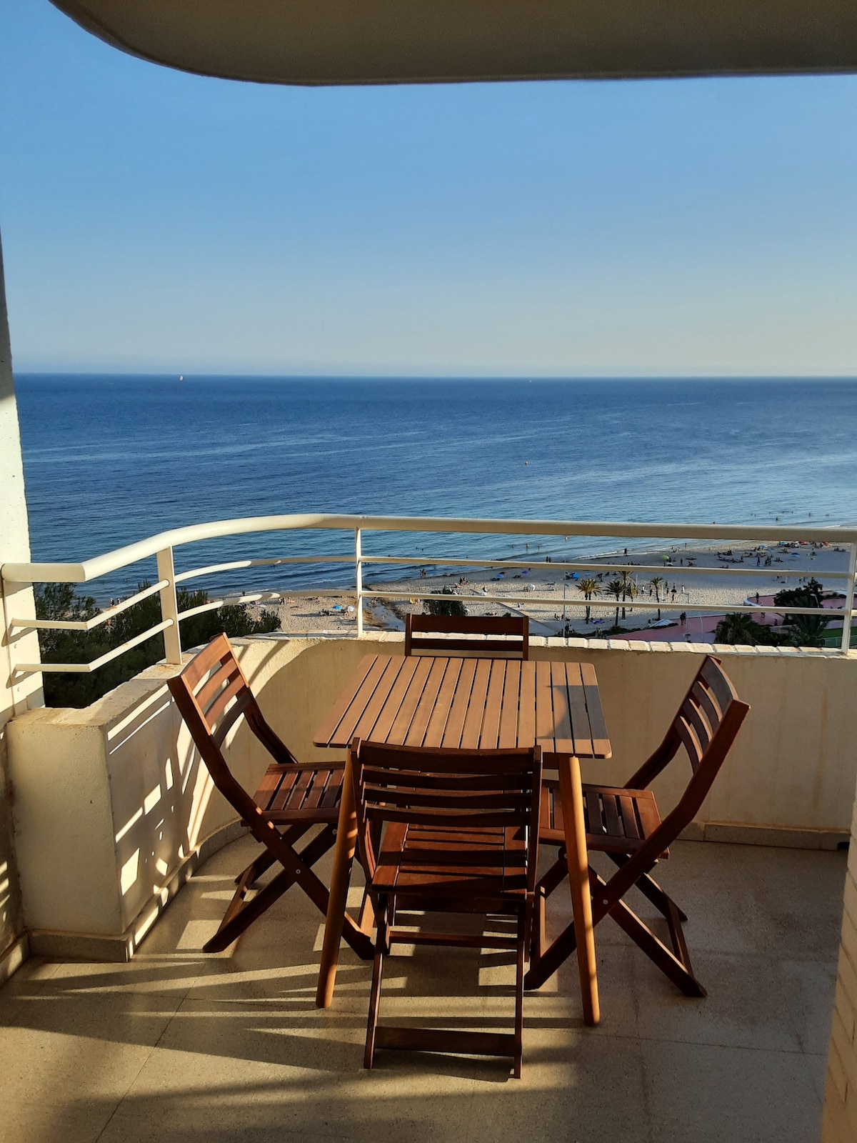 Apartamento de 2 habitaciones para 4 personas en primera línea de la playa Poniente, con vistas de la playa y el mar, terraza grande con vistas, todo exterior, salon amplio con vistas al mar, aparcamiento privado, wifi, TV, aire acondicionado, cocina completa (lavavajillas, lavadora, horno), baño completo, en urbanización con piscina, jardín muy bonito con vistas al mar y pista de tenis. La urbanización tiene acceso directo al paseo maritimo y es una de las más bonitas de la playa de Poniente.