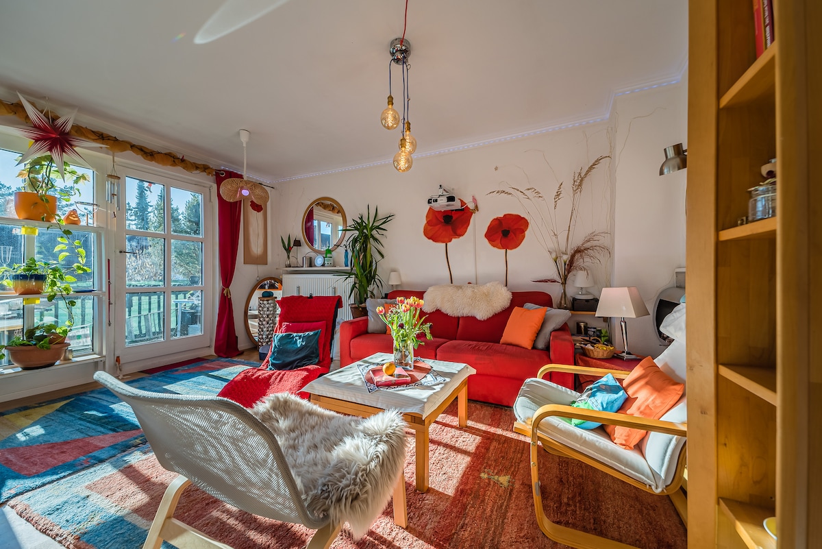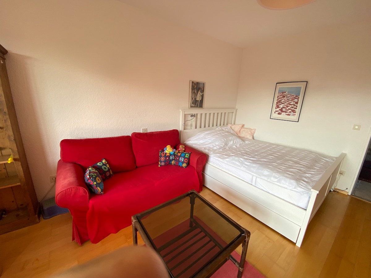 Newly renovated, modern, cosy: single room, 14sqm, in great, bright flat (kitchen, living room, large balcony), technical full equipment. OWN bathroom! OWN fridge! Full HD satellite TV. Free Wifi, Home cinema on 120" canvas (Amazon/ Netflix). Best suburban location. Quiet, safe environment. Free parking at the house! 20 minutes (S-Bahn or car) to the city centre / trade fair 10 minutes. Large local offer: gastronomy, sports, leisure, shopping. 2nd room ONLY (!) POSSIBLE ON PREVIOUS REQUEST.