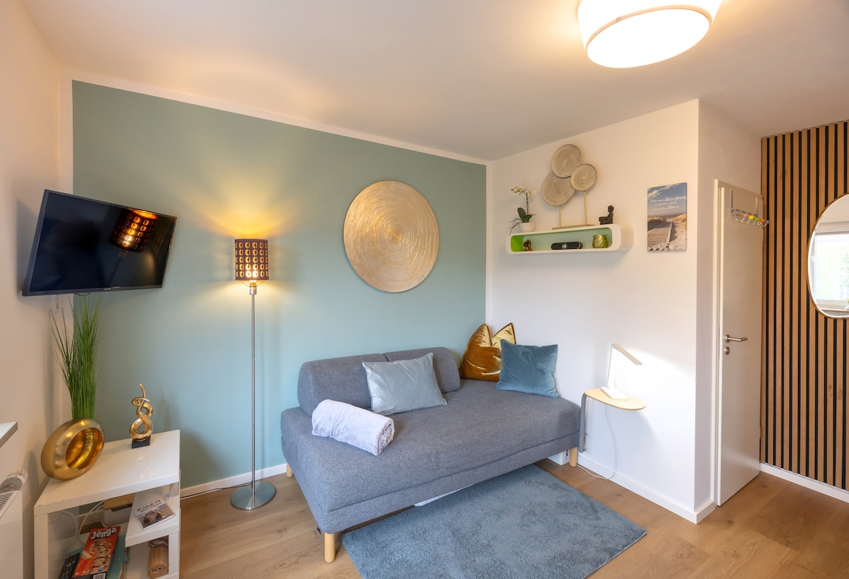 Eine helle 1-Zimmer-Wohnung wartet auf Sie!Sonnenaufgänge vom Bett mit Blick auf den See im Naturschutzgebiet macht die Lage so einzigartig.Schauen Sie dem Dampferschiff zu und genießen Sie Ihre eigene Terrasse mit Grill.Eine hochwertig ausgestattete Küche, bequemes Bett 2x2m mit viel Platz zum Träumen!Smart-TV,schnelles Internet, Schreibtisch. Breites Schlafsofa,Babybett zubuchbar.Das besondere Badezimmer hat Dusche, 2Waschbecken,WC. E-Ladesäule in 2km Entfernung.Schnell-Ladesäule 4km entfernt.