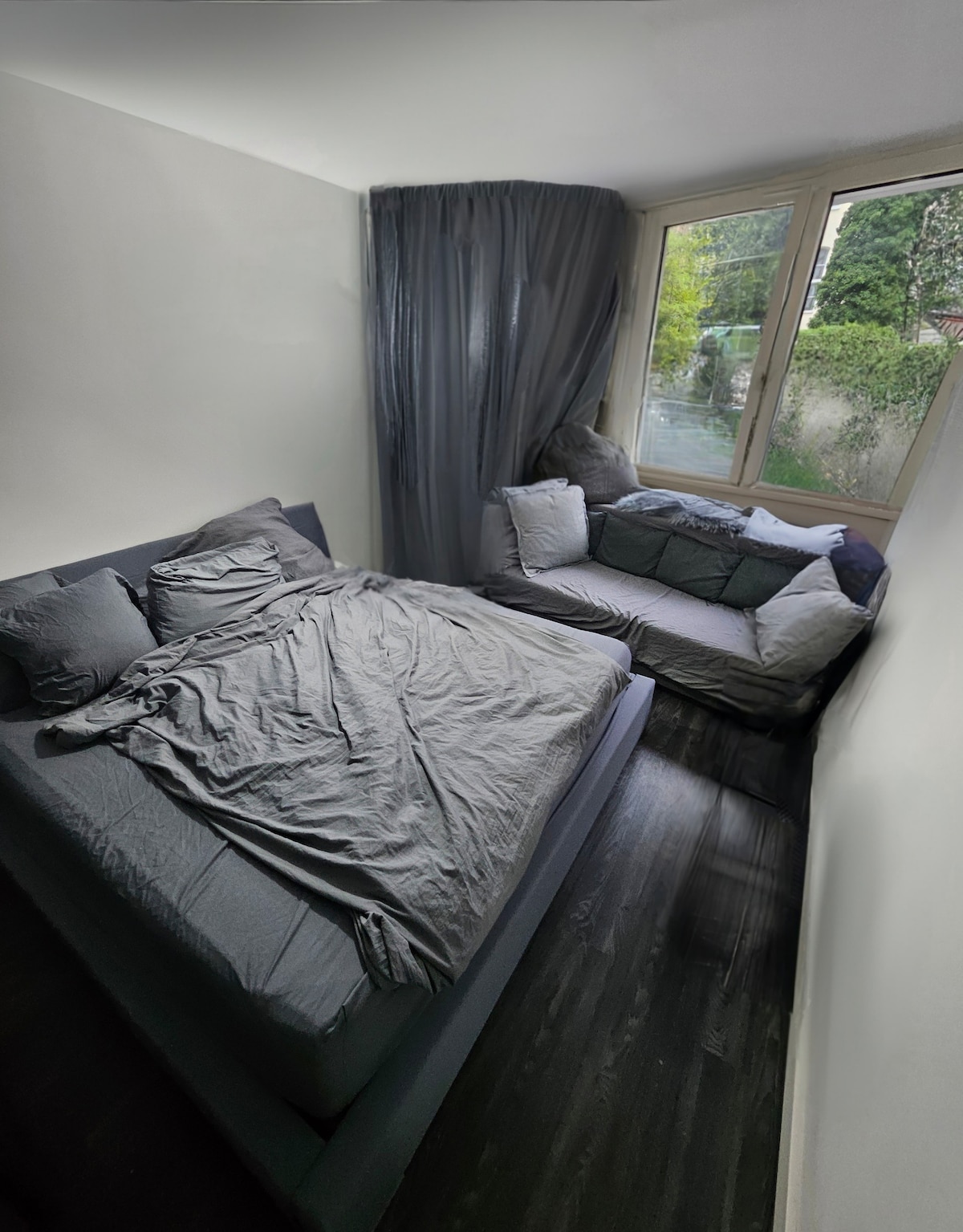 Our flat on the 5th floor (without lift :) is a gem in Munich. Built in the 90s in the roof, with wood from the Bavarian forest, it offers a hide-away from busy Munich on 100 square metres. In addition to the bathroom and the spacious bedroom, it consists of a large living room with an open-plan kitchen andwinter garden as well as a second level with an additional bed. There are many details and art on the walls to discover.