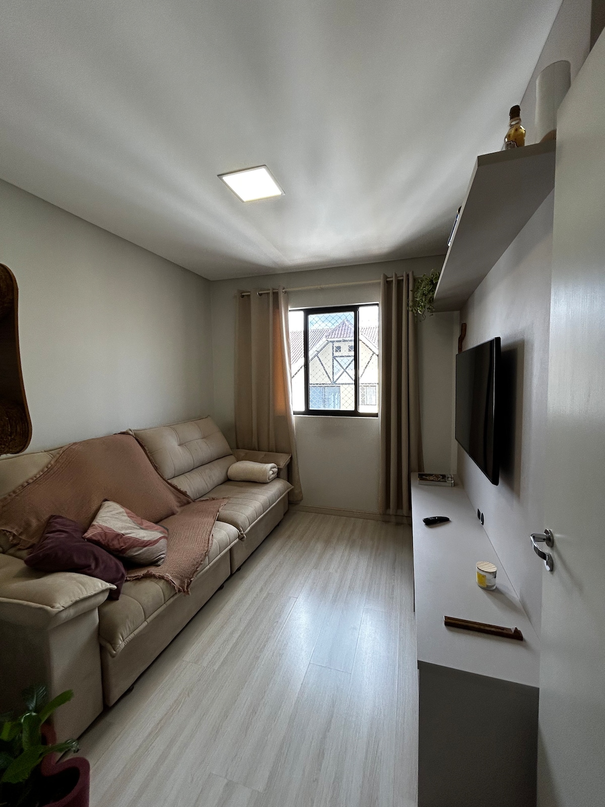 Acolhimento e praticidade em um apt. de 65m² com ar-condicionado nos 2 quartos e na sala, Smart TV, Wi-Fi rápido e sacada com vista p/ o centro. Cozinha equipada com todos os eletrodomésticos e utensílios, lavadora/secadora 11kg, secador de cabelo potente e roupas de cama e toalhas 100% algodão inclusas. Estacionamento coberto gratuito. Localização tranquila, a 10 min do centro e 20 min do aeroporto, próximo a mercado, farmácia e posto de saúde. Obs.: apartamento no 3º andar, acesso por escadas