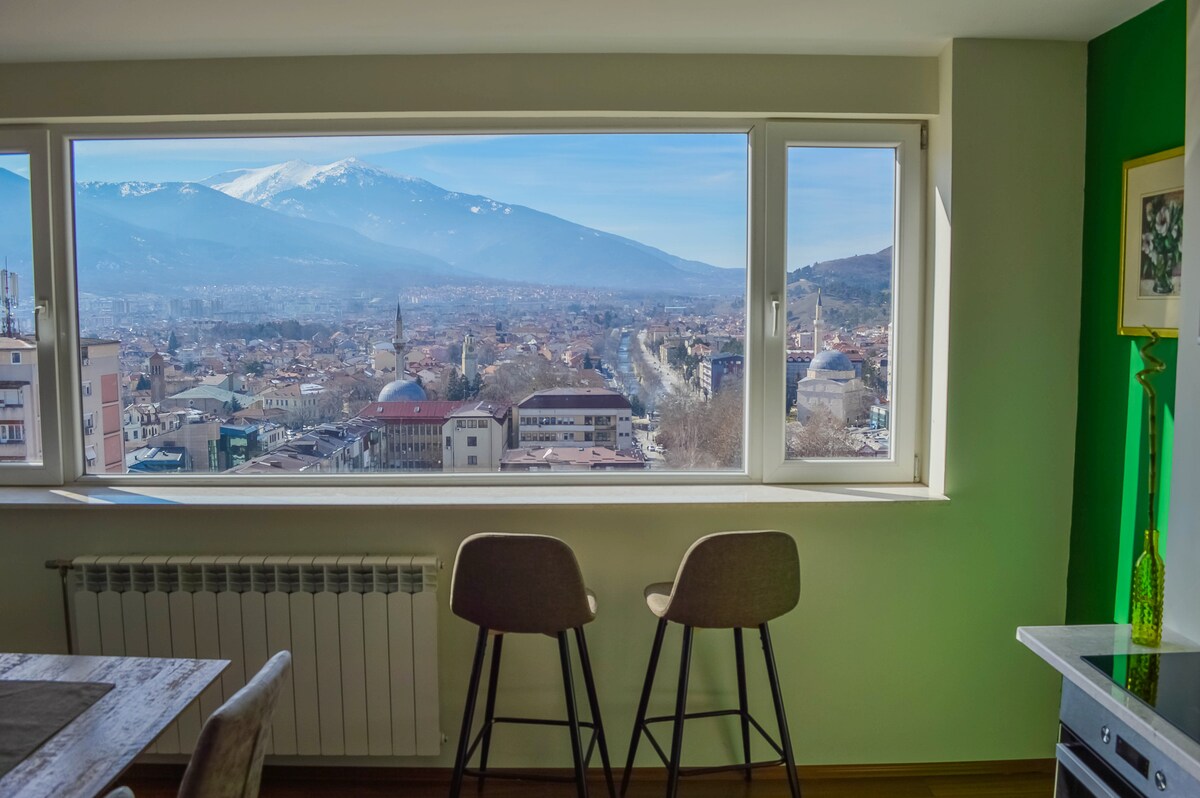 Enjoy your stay in this delightful 1 bedroom apartment on the 4th floor, directly accessible by elevator. Experience breathtaking view of Pelister and the city center! The spacious open living area, fully equipped kitchen and two TVs provide comfort and convenience. For safety, the building features secure entry with video surveillance. Free parking is available behind the building, with indoor options on request. Just minutes from essential attraction - book your stay today!
