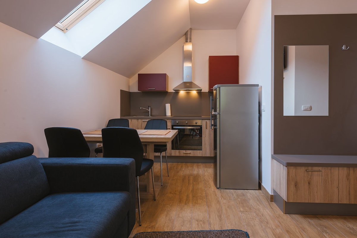 Apartments Pavc are situated 4km from Bohinj lake. This apartment is most suitable for a couple but it has an additional bed (a sofa that streches) so 4 people can sleep in it. It is a completely new and furnished apartment. It contains a fully equipped kitchen, a bathroom, a living room and a bedroom. it also has its own balcony with a beautiful view of the surrounding area. Our property also has a barn so we have some animals you can see, such as cows, hens, sheep and rabbits.