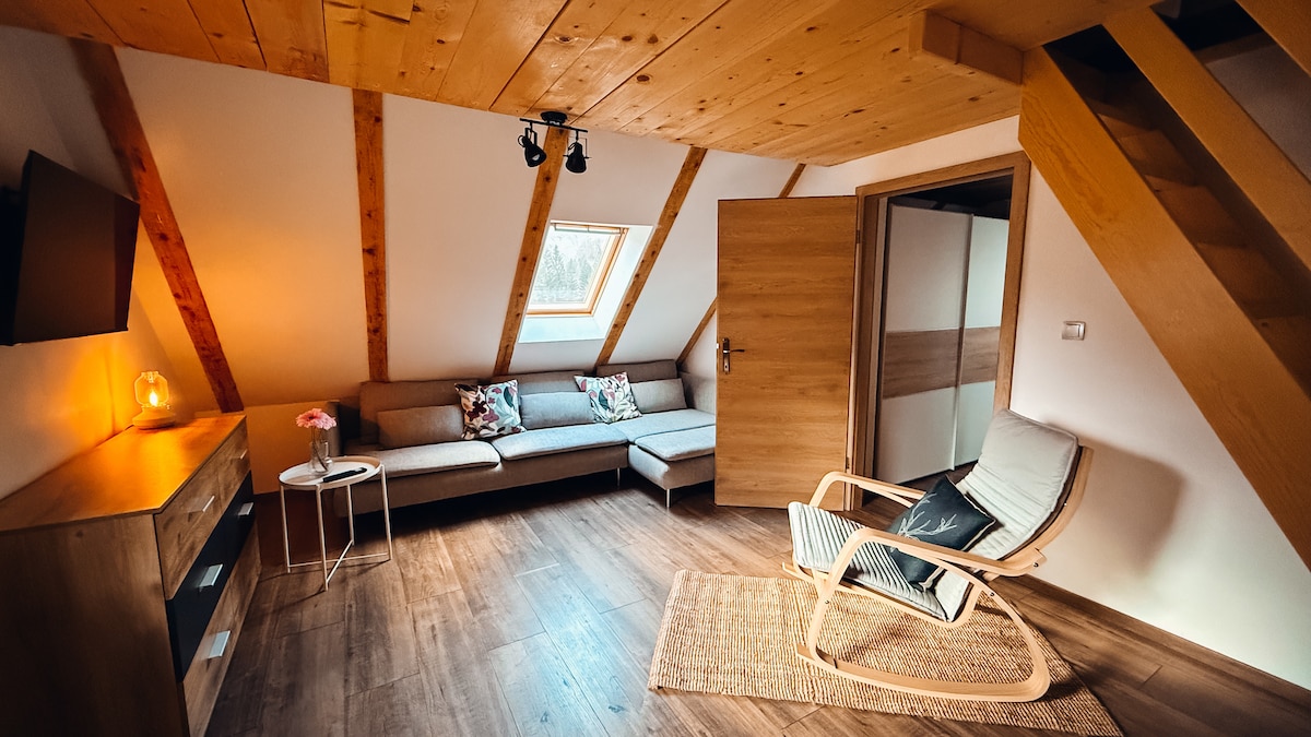 The elegant Cabins are furnished in the modern minimalistic style. The panoramic floor-to-ceiling windows makes the rooms bright so you can enjoy an amazing landscape view of the high peaks of Julian Alps. Each unit comes with a large wooden terrace equipped with loungers and a hammock. Sleeping area is located on the upper floor accessible by a steeper staircase that might give you a feeling of climbing a ladder. Each Cabin is equipped with Nespresso coffee machine and V60 pour-over coffee set.