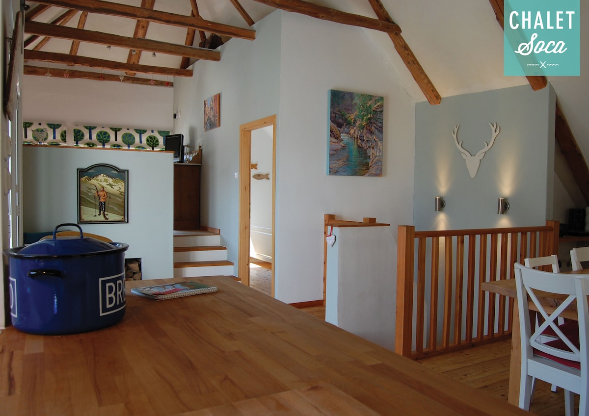 The brand new Chalet Studio GOVIC is located on the first floor. It features a private terrace, under-floor central heating, a well equipped kitchen with dining table and a bedroom with a fireplace. The studio has a TV with cable channels. There is a private bathroom with shower, hairdryer and free toiletries. Bed linen and towels are provided. Free high-speed Wi-Fi is available in all areas.