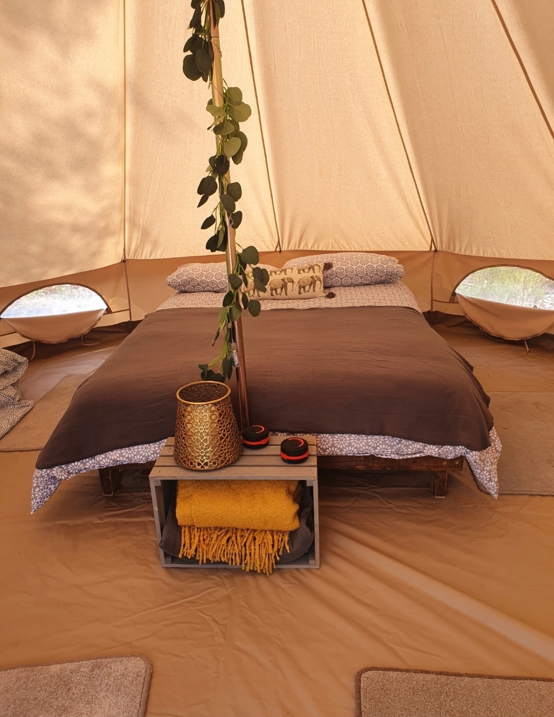 Our Bell Tent is a boutique Glamping experience for two with the option to include a third person. Beautifully furnished with a queen size bed, indoor and outdoor seating, feather pillows, wool blankets, cosy coir flooring, and decorated with handcrafted bunting and solar lights. Start your day with a continental breakfast. Unplug under canvas in our charming tent.