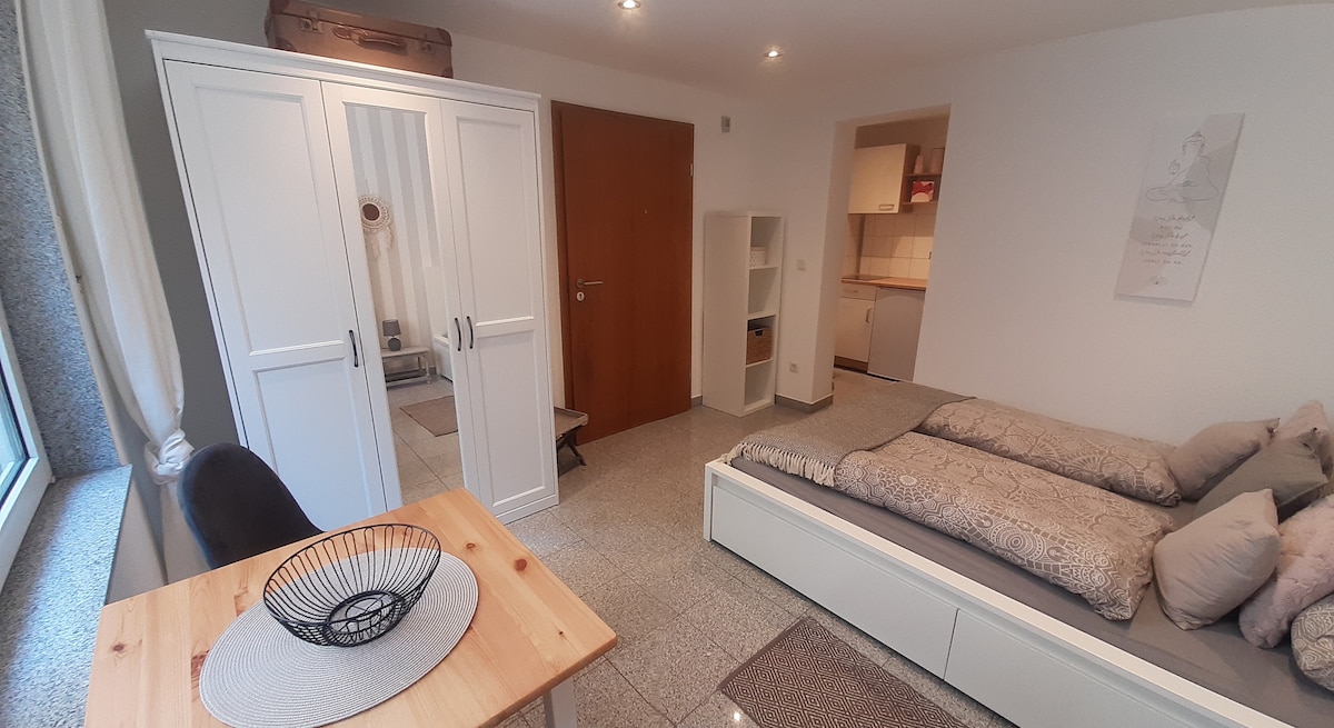 24h self Check in/out,bed, bike and more, neue eigene ganze 13qm Unterkunft im EG, separat Zugang, ruhig, 1 Doppel/Einzelbett, kleines Bad (Dusche 1.2 mal 0,8), Waschbecken + WC) kleine Küche mit Kühlschrank, Mikrowelle mit Backen, Schreibtisch mit Stuhl, elektrischer Relaxsessel, Tisch, 2 Stühle, Kleiderstange + Regale, Kabel TV+ Alexa, Parkplatz, Wlan + bikes free , 350m-Aasee, -Bäcker , 550m-Supermarkt. 3km City, 400m-A1/A43, 20m Busstop, City + Uni: 12 min