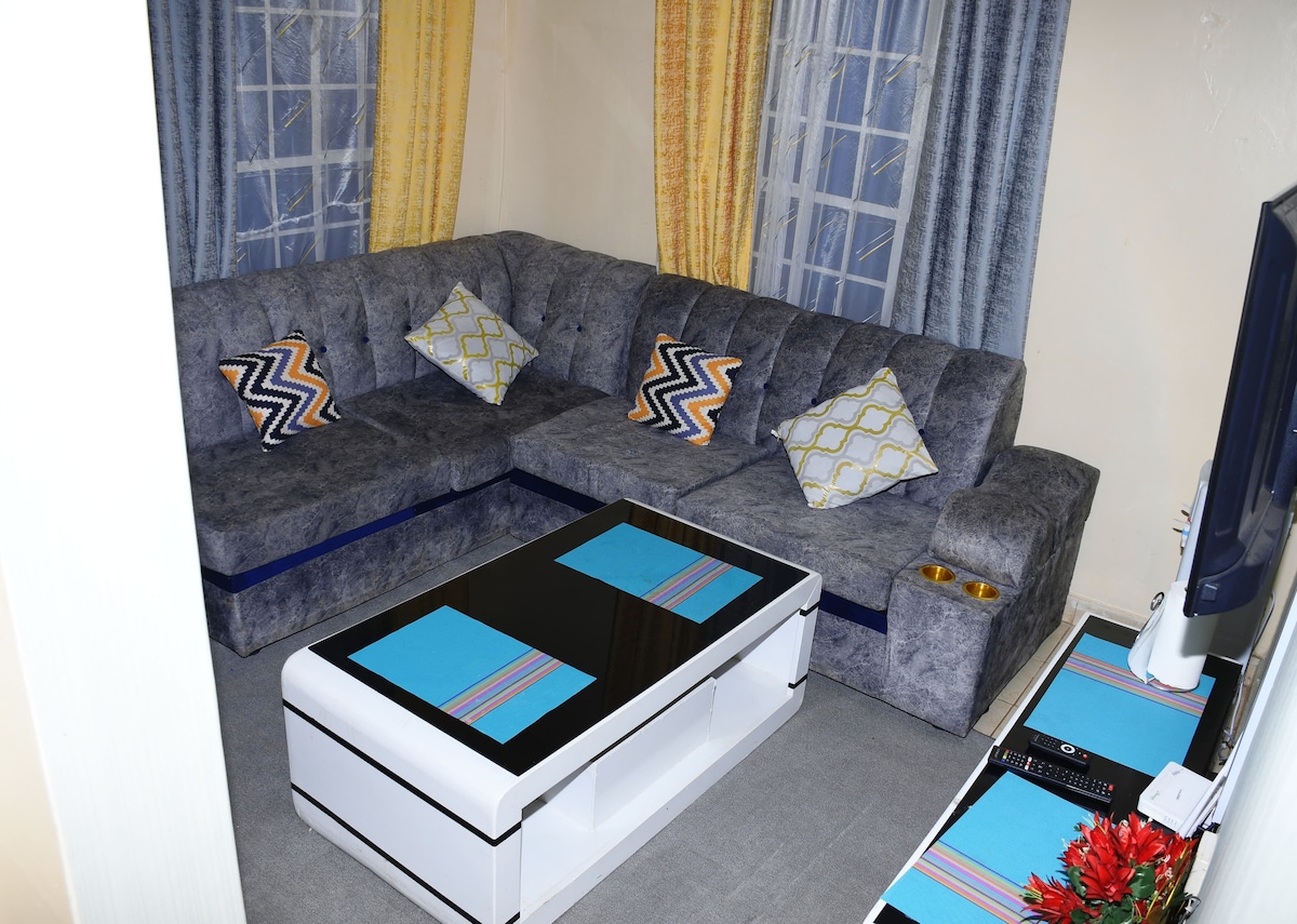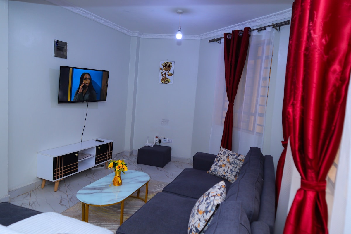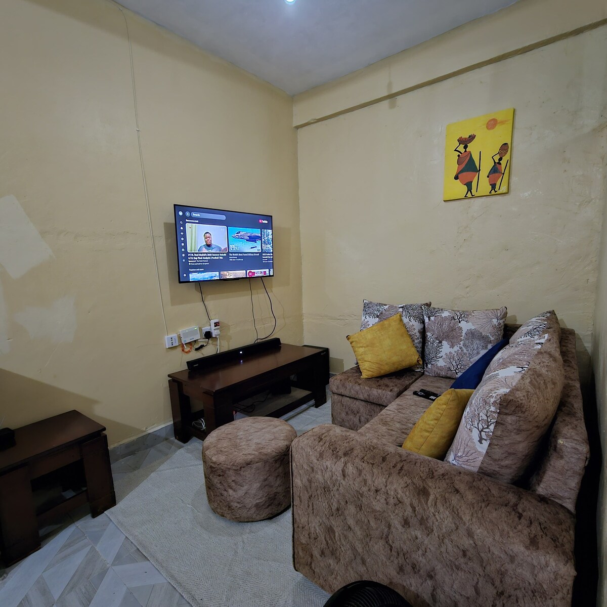 This is an executive,modern and very stylish fully furnished 1br apartment with 24/7 security and a smart tv,super fast WiFi, Netflix and a fully fitted kitchen..It is clean,practical and has a beautiful colour scheme with tasteful furnishing..It's a 10mins walk to Naivas supermarket,8mins to Chicken Inn and Pizza Inn,15mins to Quickmart,kfc,V-spot club and 2 mins to Night Fall park..It's a perfect getaway-chic yet cosy..Ideal for rest,work or vacation..