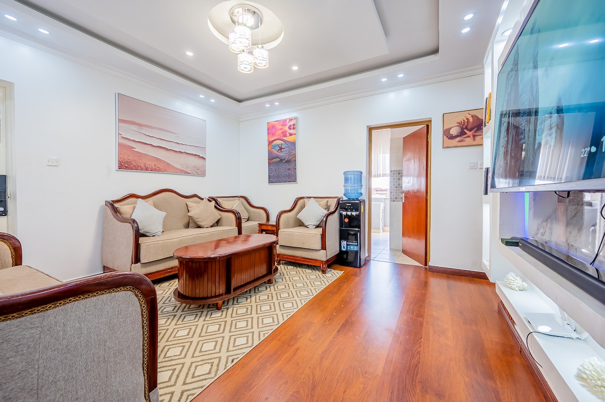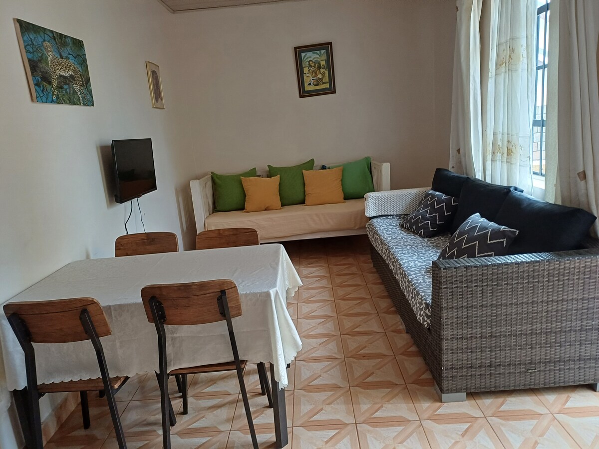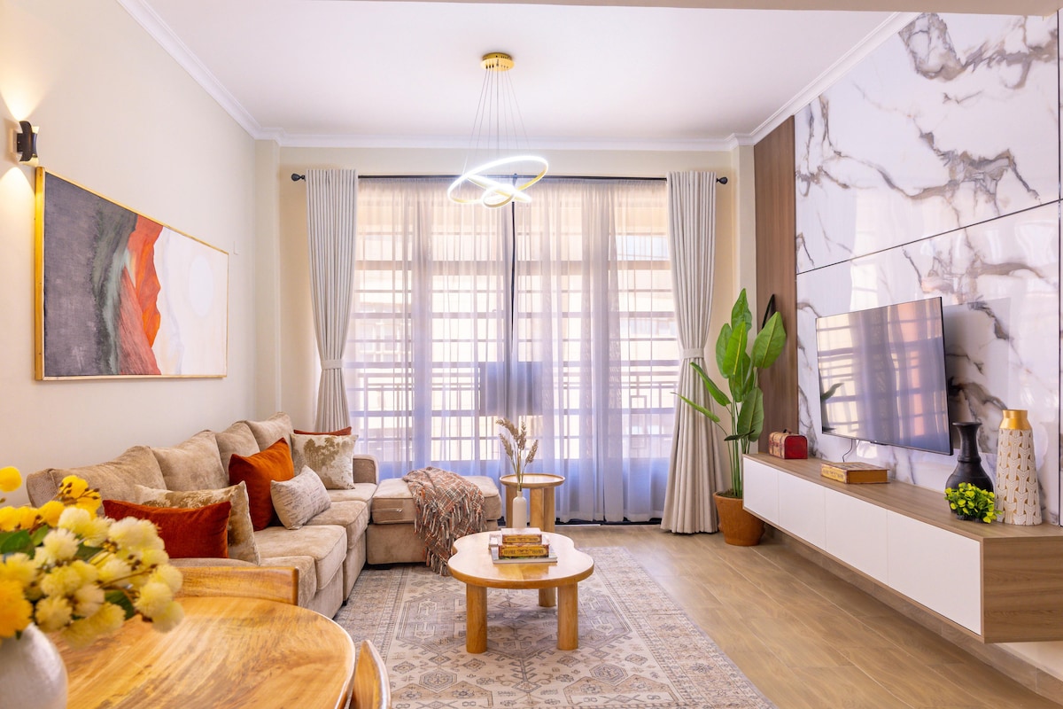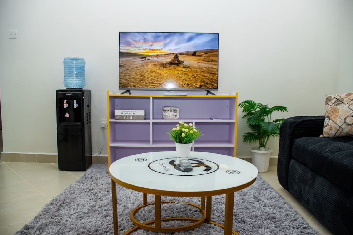 This is an executive,modern and very stylish fully furnished 1br apartment with 24/7 security and a smart tv,super fast WiFi, Netflix and a fully fitted kitchen..It is clean,practical and has a beautiful colour scheme with tasteful furnishing..It's a 10mins walk to Naivas supermarket,8mins to Chicken Inn and Pizza Inn,15mins to Quickmart,kfc,V-spot club and 2 mins to Night Fall park..It's a perfect getaway-chic yet cosy..Ideal for rest,work or vacation..