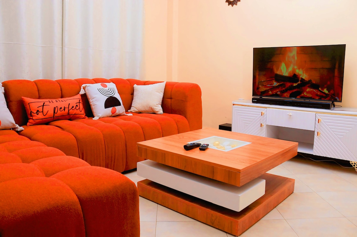 Enjoy a big screen frameless TV for quality Netflix & DSTV time , a classy and very comfortable sofa, Glass door & Windows for perfect lighting, live plants, separate toilet and bathroom with a hot shower, a balcony with a good view, kitchen amenities for cooking, heating and freezing food, washing machine with a dryer, ease of access due to close proximity to the highway, Dedicated Wi-Fi, all kinds of shops and restaurants in the estate, etc.