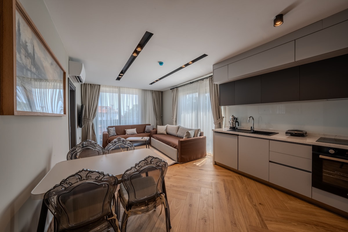 It is very close to the Airport, Bus Station, Public Transportation and Tram in Antalya Center. It is only 2 KM away from the world-famous Konyaalti Beaches. Apart: Consists of 1 Bedroom + 1 Living Room + Mini Kitchen and Private Bathroom. Maximum 2 Adults + 1 Child allowed Erasta Shopping Mall: 1 KM - 2 Min Weaving Park: 1 KM - 2 Min Tram: 1 KM - 2 Min Konyaalti Beaches: 2 KM - 5 Min Cliffs: 6 KM - 8 Min Bus Terminal: 7 KM - 10 Min Kaleiçi: 12 KM - 13 Min Airport : 18 KM - 20 Min