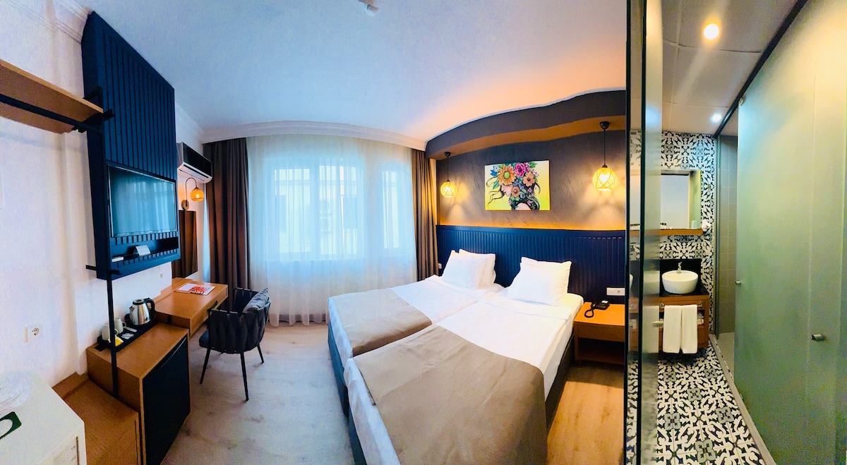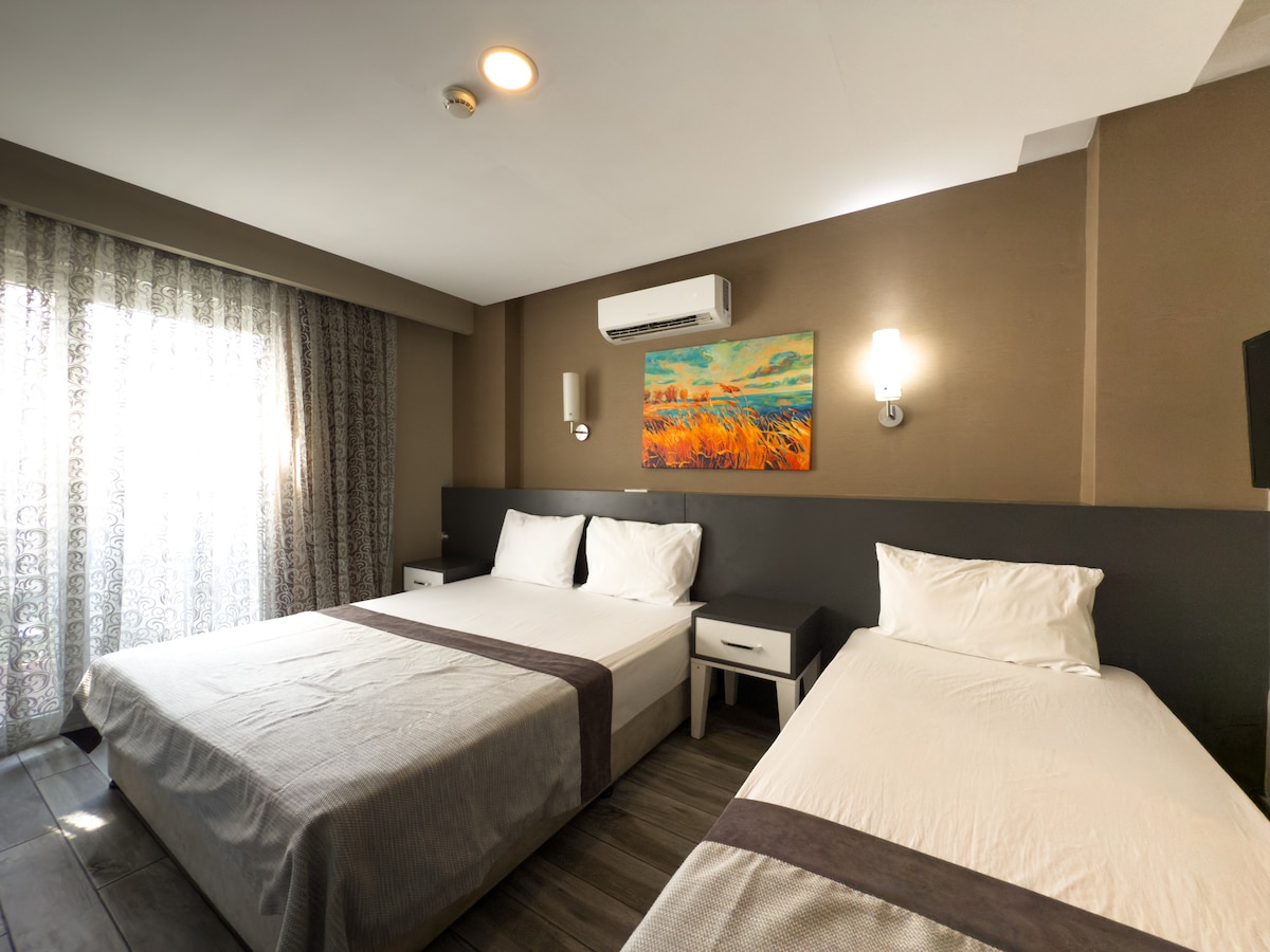Our hotel offers modern comfort with private bathrooms, air conditioning, and free Wi-Fi in every room. Enjoy our spacious restaurant and bar. Just a 2-minute walk to the beach road and 10 minutes to Terracity, Antalya's largest mall. Surrounding the hotel, you'll find markets, cafes, restaurants, pharmacies, and entertainment centers, all within walking distance for your convenience.