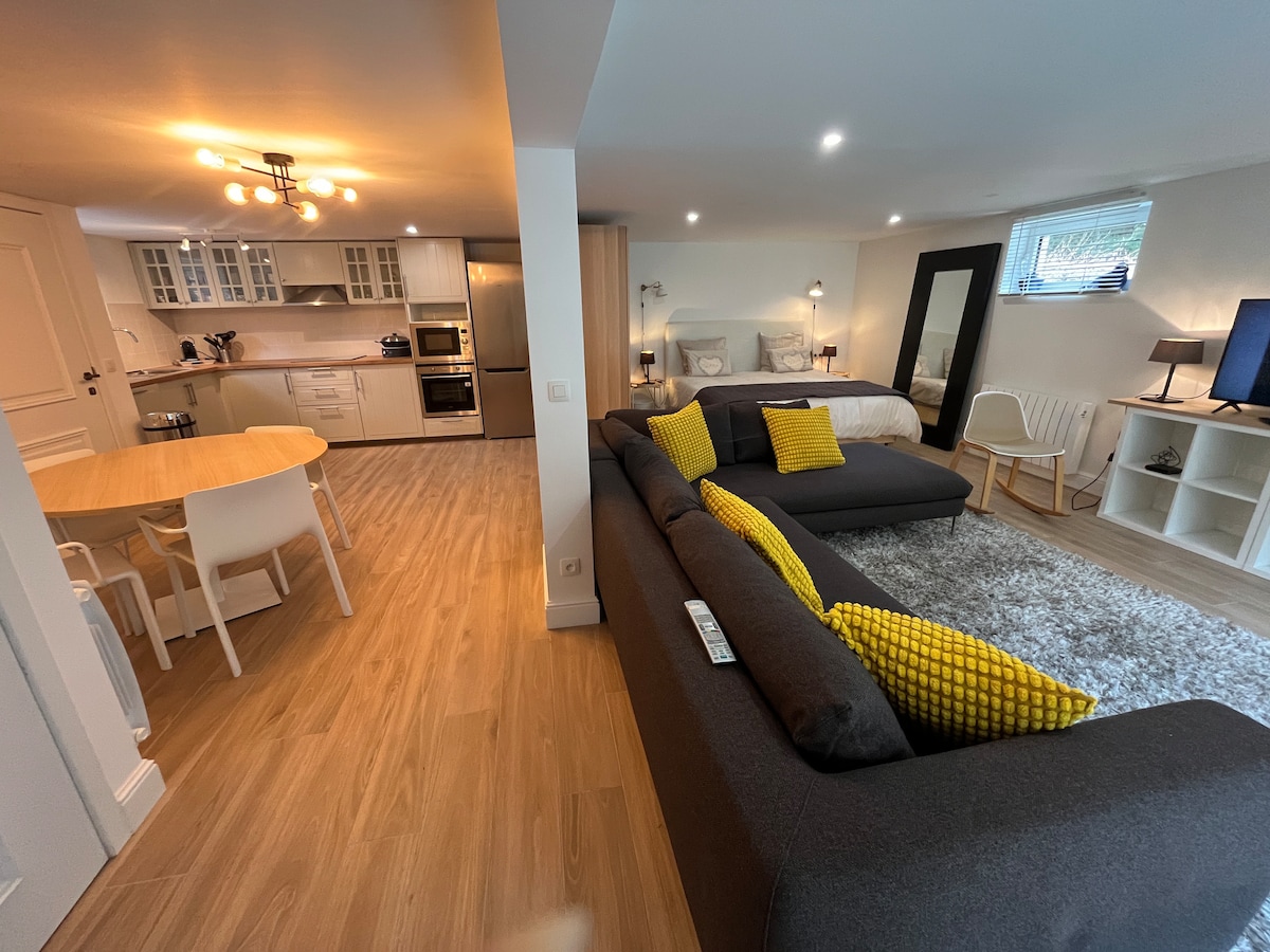 Notre gîte a été entièrement refait à neuf et peut accueillir jusqu'à 4 personnes. Au rez-de-chaussée, vous trouverez un bel espace de vie avec un accès privé sur la terrasse et le jardin. Le salon est composé d'un canapé, d'une télévision avec un lecteur DVD. La cuisine est équipée et est ouverte sur l’espace repas. Vous aurez accès à la salle de bain (douche à l'italienne, meuble avec vasque). A l'étage il y a deux chambres et un espace bureau. Un local fermé est accessible au sous-sol.