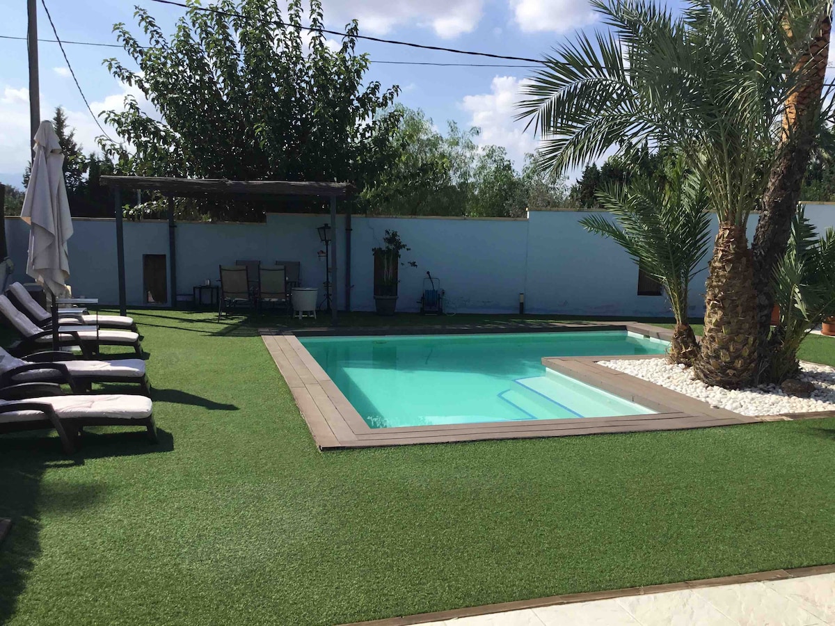Preciosa casa unifamiliar, con parcela de 1200 mtrs en pleno corazón de la huerta murciana, muy cerca de Murcia ciudad, con piscina y zona de barbacoa. Ideal para unas vacaciones, sobre todo en verano,en familia o con amigos. La vivienda dispone de 3 dormitorios, el principal con baño en suite y vestidor ,un amplio baño completo para el resto. Un gran salón de 45 mtrs con amplia zona de estar y comedor. Una bonita cocina con despensa y lavadero Amplia terraza y porche.