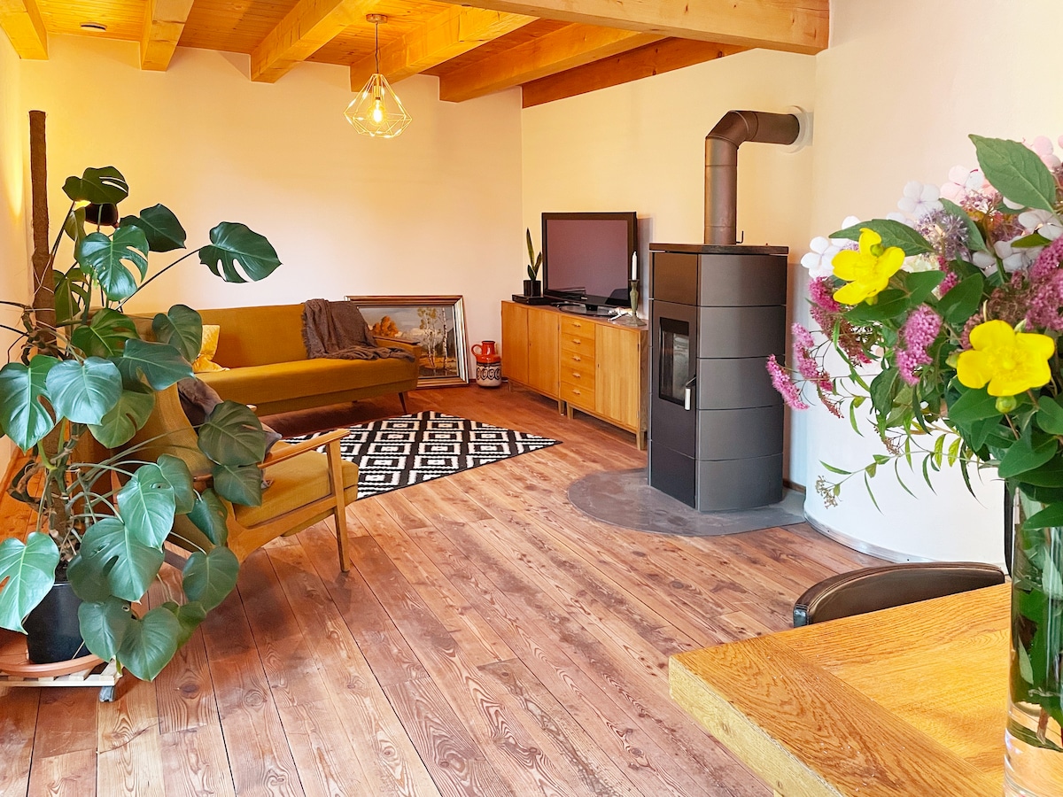 Sehr ruhige, gemütliche und stilvolle Ferienwohnung am Bach. Altbau mit Holz- und Steinböden. Neues Bad und neue Küche. Eine Mischung aus Alt und Neu mit viel Kunst und Kultur garniert. Im Sommer kann man auf der teilweise überdachten Terrasse oder im Garten im Liegestuhl entspannen. Der Garten ist zu mehr als der Hälfte naturnah gestaltet, mit Orchideen, anderen Wildblumen und Gräsern. In der kalten Jahreszeit werden Sie mit prasselndem Feuer im Kaminofen begrüsst und mit Kaminholz versorgt