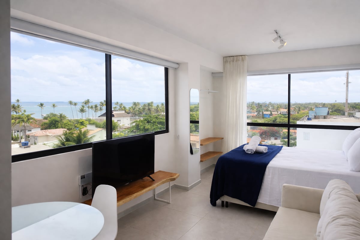 Studio no Marulhos Suites Resort. Cama queen, bicama, colchão extra, ar condicionado, internet boa e smart tv. A cozinha conta com geladeira, Gelágua, cafeteira, sanduicheira e os demais utensílios de cozinha. Apto aconchegante de frente para as piscinas. O hotel é de primeira, conta com várias piscinas, sauna, academia, campos de futebol e tênis, área de jogos e recreação todos os dias para a criançada. Ja tenho alguns anos alugando esse e outros flats em muro alto, então pode confiar!
