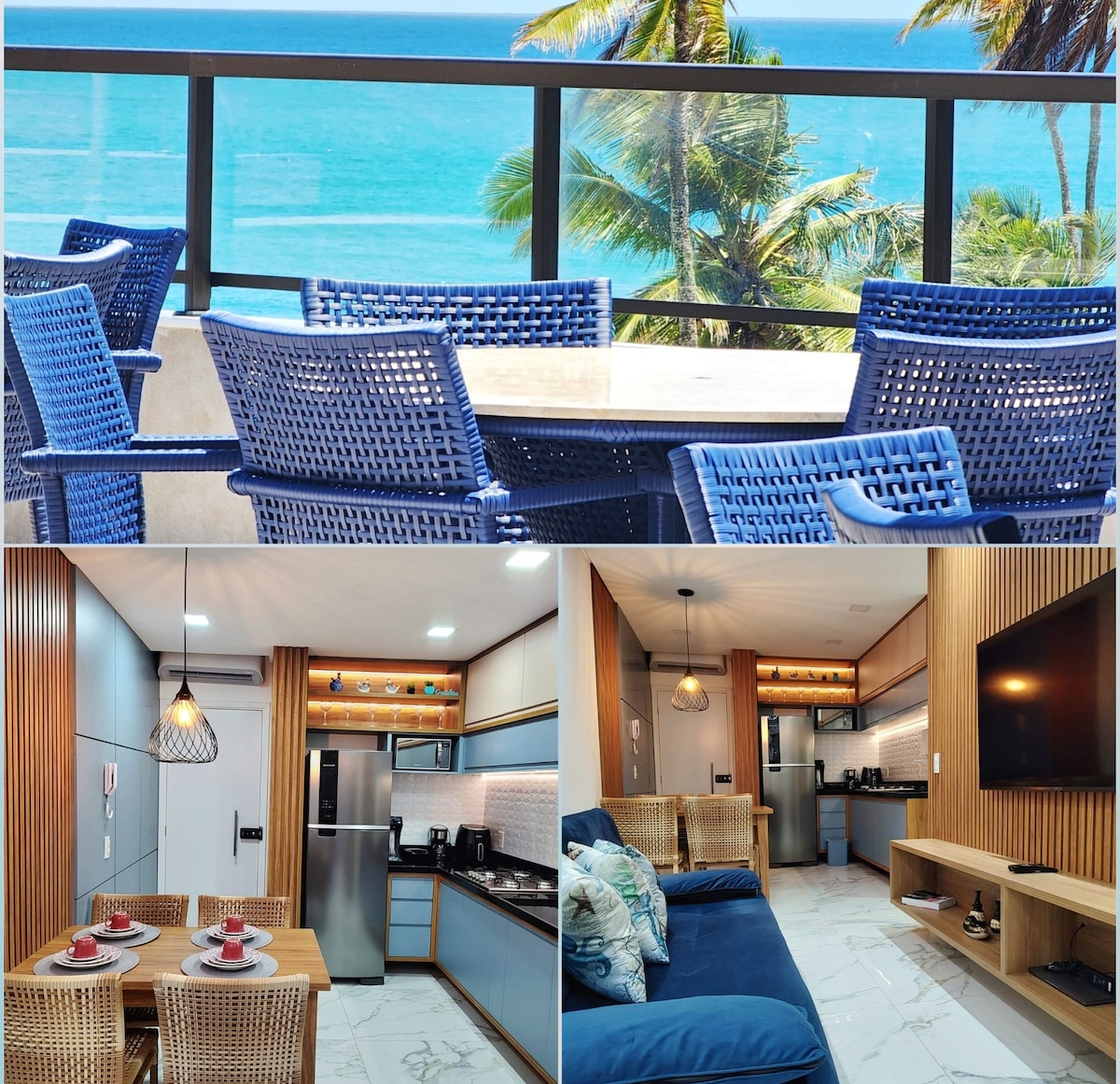Melhor localização a beira-mar de Muro Alto. Praia simplesmente perfeita para família. Lindo apartamento vista mar e piscina, 3 banheiros sendo 1 lavabo+ 2 suites (uma com cama casal e outra com cama Queen reversível para duas camas solteirão) totalmente equipado, cozinha completíssima, smartTV, Wifi, varanda gourmet. Condomínio pé na areia super estruturado com serviço de praia, parquinho, campinho, mini mercado, academia e estacionamento