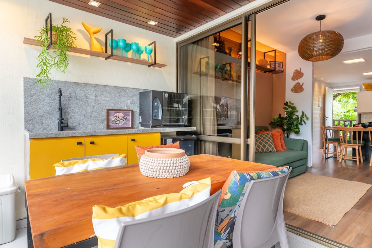 Cuidamos de todos os detalhes para oferecer uma experiência de muito conforto. Não basta estar no paraíso, tem que ter conforto! Por isso, investimos em camas e enxoval de altíssima qualidade. Nossas toalhas de banho são troussardi. Nossas cortinas contam com blackout e tecido antialérgico. Todos os colchões têm protetores. Ar condicionado nos quartos. Ótimas duchas de banho. Da sala de estar/jantar é possível aproveitar a brisa do mar, com vista e toda comodidade. Varanda gourmet.