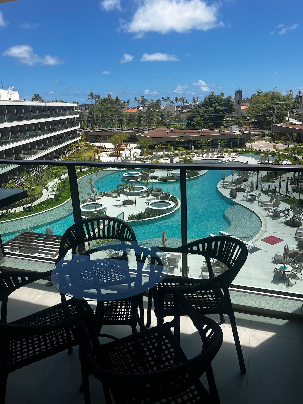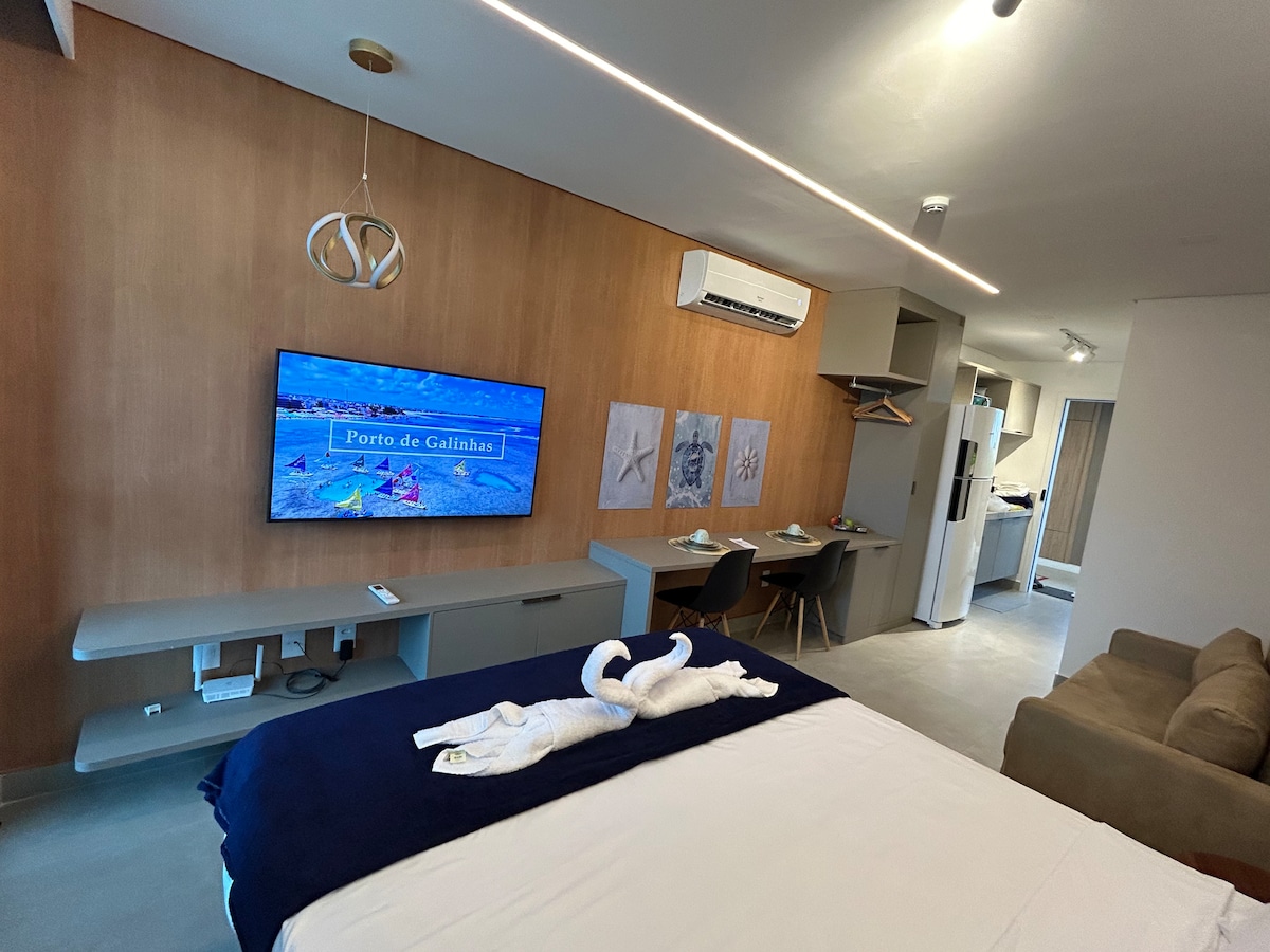 Nosso Lindo e equipado studio com varanda gourmet foi planejado para proporcionar o máximo de conforto aos seus hóspedes. Com 1 cama de casal confortável, 1 colchão auxiliar e 1 excelente sofá cama, acomodamos bem até 4 hóspedes. O Flat possui uma decoração sofisticada que proporciona um ambiente relaxante após um dia de passeios em Porto de Galinhas e Muro Alto. A Cereja do Bolo é nossa varanda gourmet com uma ótima mesa para refeições e vista para o complexo aquático do empreendimento. A cozinha completa é equipada com os principais eletrodomésticos, como geladeira, microondas, cooktop eletrico, cafeteira, liquidificador, sanduicheira e airfryer, além de todos os utensílios necessários para que você possa preparar suas refeições de maneira prática e confortável. O espaço foi projetado para que você tenha tudo o que precisa ao seu alcance, garantindo uma estadia funcional e aconchegante. O apartamento está localizado em um condomínio que oferece uma estrutura completa de lazer com várias piscinas, playground, campo, academia, brinquedoteca, carregamento para carro elétrico, lavanderia, etc.. Temos Ferro de passar e secador de cabelos para maior comodidade dos nossos hóspedes. Se você busca uma acomodação premium, com bastante conforto e espaço, acabou de encontrar o que procurava.