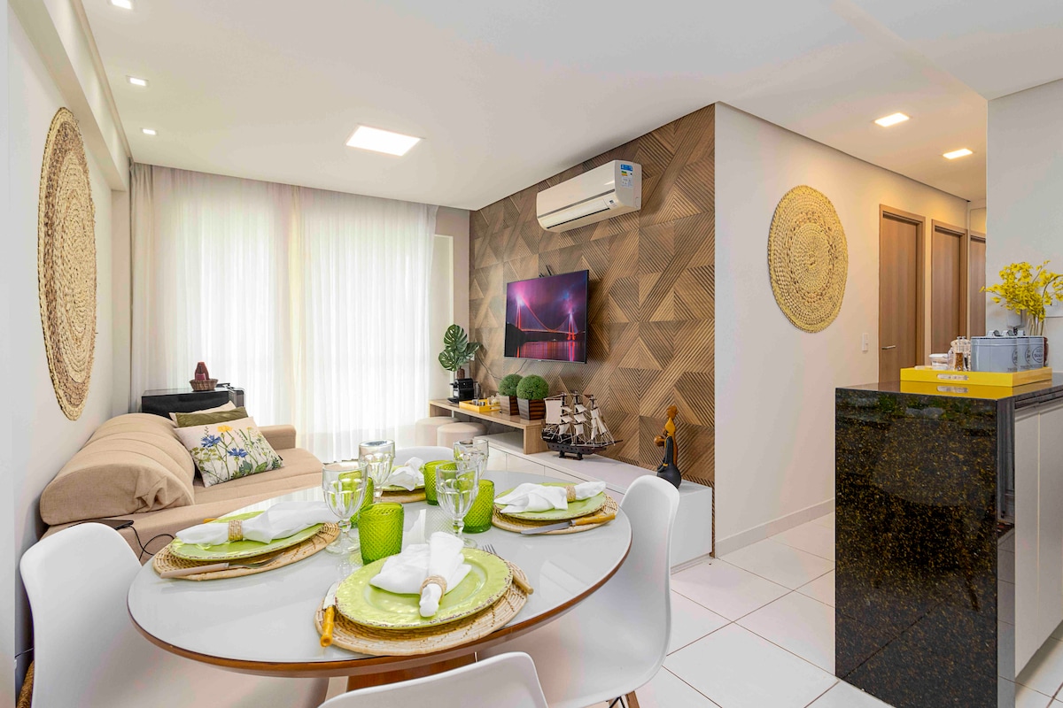 Casa/flat duplex, compacta mas bem dividida, e organizada com móveis e eletrodomésticos modernos e novos . Hospedamos confortavelmente 10 pessoas, distribuídas em 4 quartos (sendo 1 suite), todos os quartos com ar condicionado SPLIT e cama-box . Após um dia de passeio você pode relaxar na sauna que dá acesso a piscina e na hidromassagem da piscina (jacuzzi). O espaço fica próximo de transporte público e fácil acesso ao centro turístico. Você vai amar o ambiente, a área comum e a iluminação.