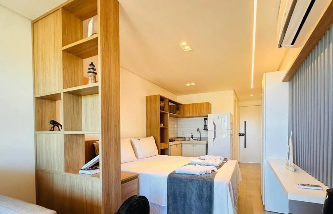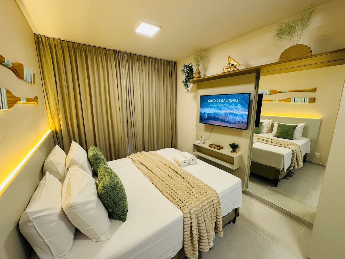 Studio no Marulhos Suites Resort. Cama queen, bicama, colchão extra, ar condicionado, internet boa e smart tv. A cozinha conta com geladeira, Gelágua, cafeteira, sanduicheira e os demais utensílios de cozinha. Apto aconchegante de frente para as piscinas. O hotel é de primeira, conta com várias piscinas, sauna, academia, campos de futebol e tênis, área de jogos e recreação todos os dias para a criançada. Ja tenho alguns anos alugando esse e outros flats em muro alto, então pode confiar!