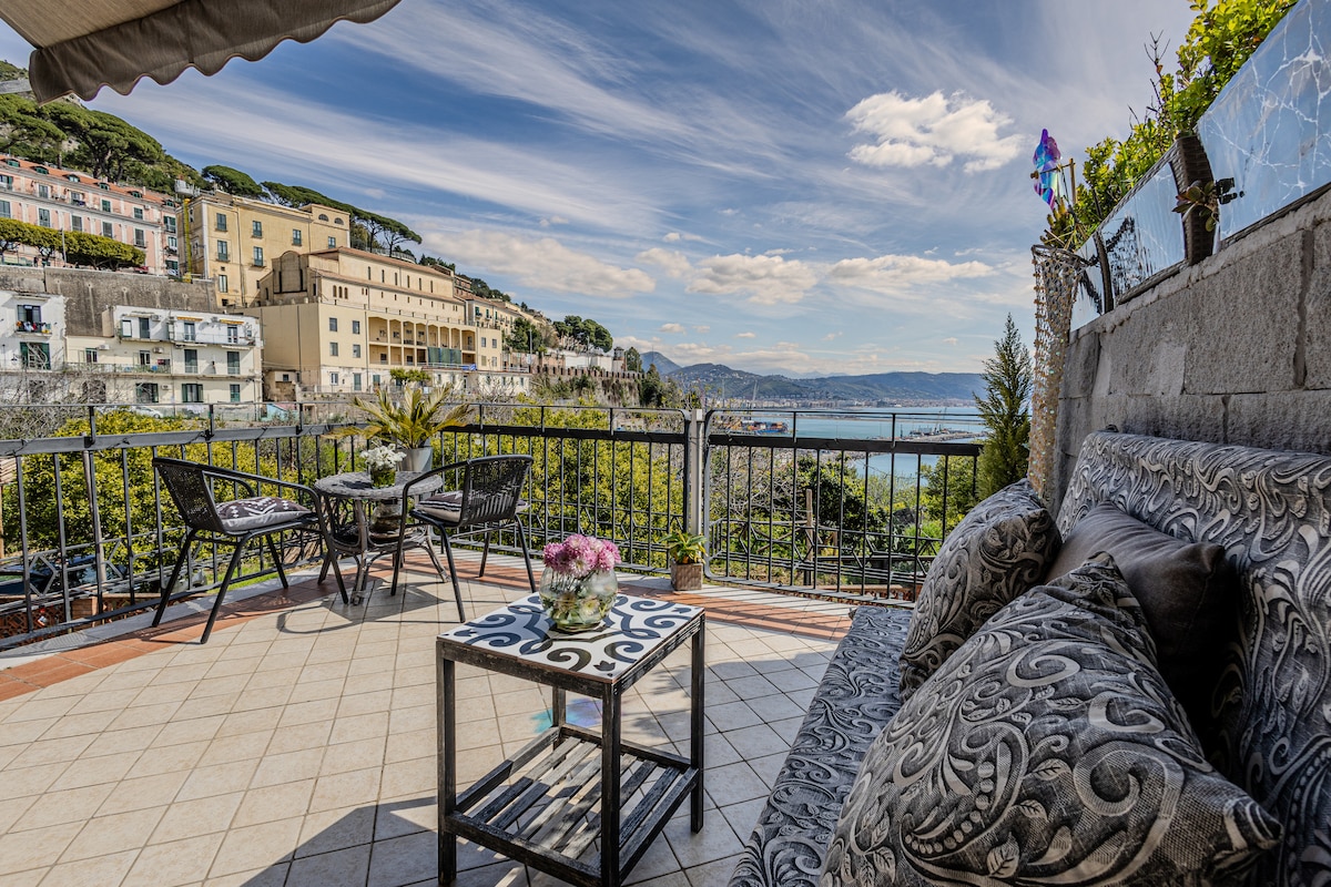 Incastonato tra le stradine ombrose del centro storico alto di Salerno, delizioso appartamento con 2 terrazze e vista mozzafiato sull'azzurro mare della Costiera Amalfitana (AD USO ESCLUSIVO DELL'OSPITE) Silenzioso e arieggiato, ideale per chi vuole godere di momenti di relax, ma anche per visitare le principali attrazioni turistiche, raggiungibili con una breve e affascinante passeggiata. Arredato con gusto e arredi di design, senza dimenticare l'inconfondibile stile della tradizione vietrese.