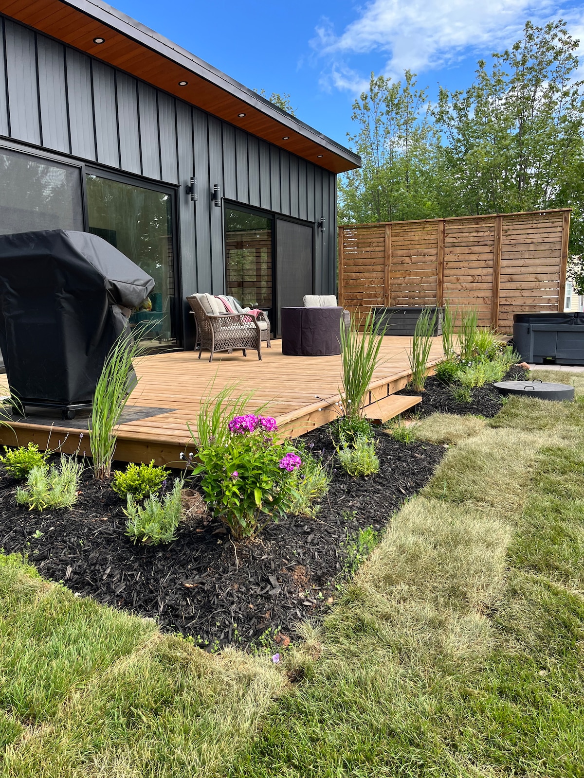 (Français en bas) Kick back and relax in this calm, stylish space. This is a 4 season private oasis. You can enjoy the stars on a clear night sky around the fire pit or in the comforting warmth of the spa. The large deck offers plenty of space for your workout session or your grilling skills! The gazebo is a great place to sip your morning coffee or glass of wine. Walking distance to a tranquil beach and conveniently located near the beaches of Parlee (Shediac) and Aboiteau (Cap-Pelé).