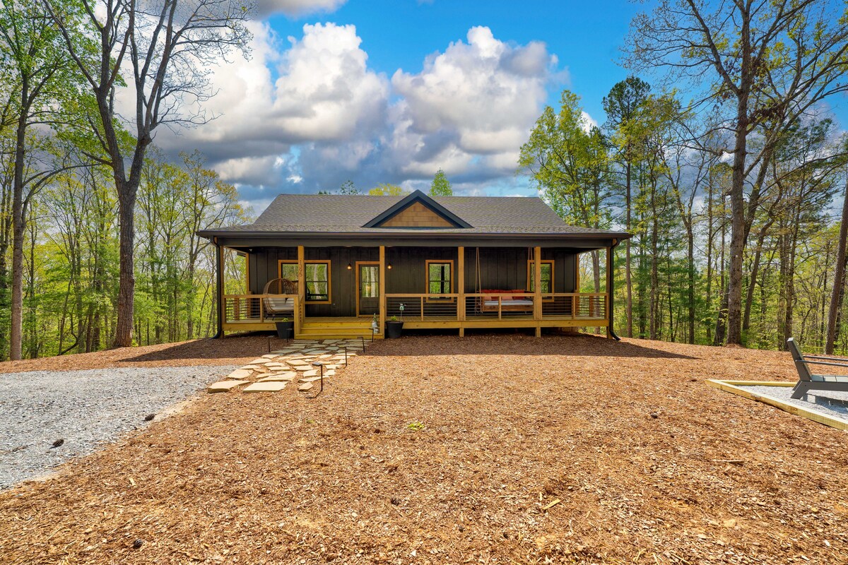 Immerse yourself in nature at this Modern Mountain retreat. - Private Sauna & Hot Tub with Nature Views - Fire Pit with string lights - Spacious back deck with outdoor dining, fireplace, and 60" TV - Gas Grill - 2 King Beds + 1 Queen Bed - Egg chair and swinging bed on Front Porch - 5 minutes to Carters Lake - boat ramp access within 1.5 miles - 5 minutes to Tumbling Waters Hiking Trail - 15 minutes to Ellijay - 35 minutes to Blue Ridge - 45 minutes to Amicalola Falls