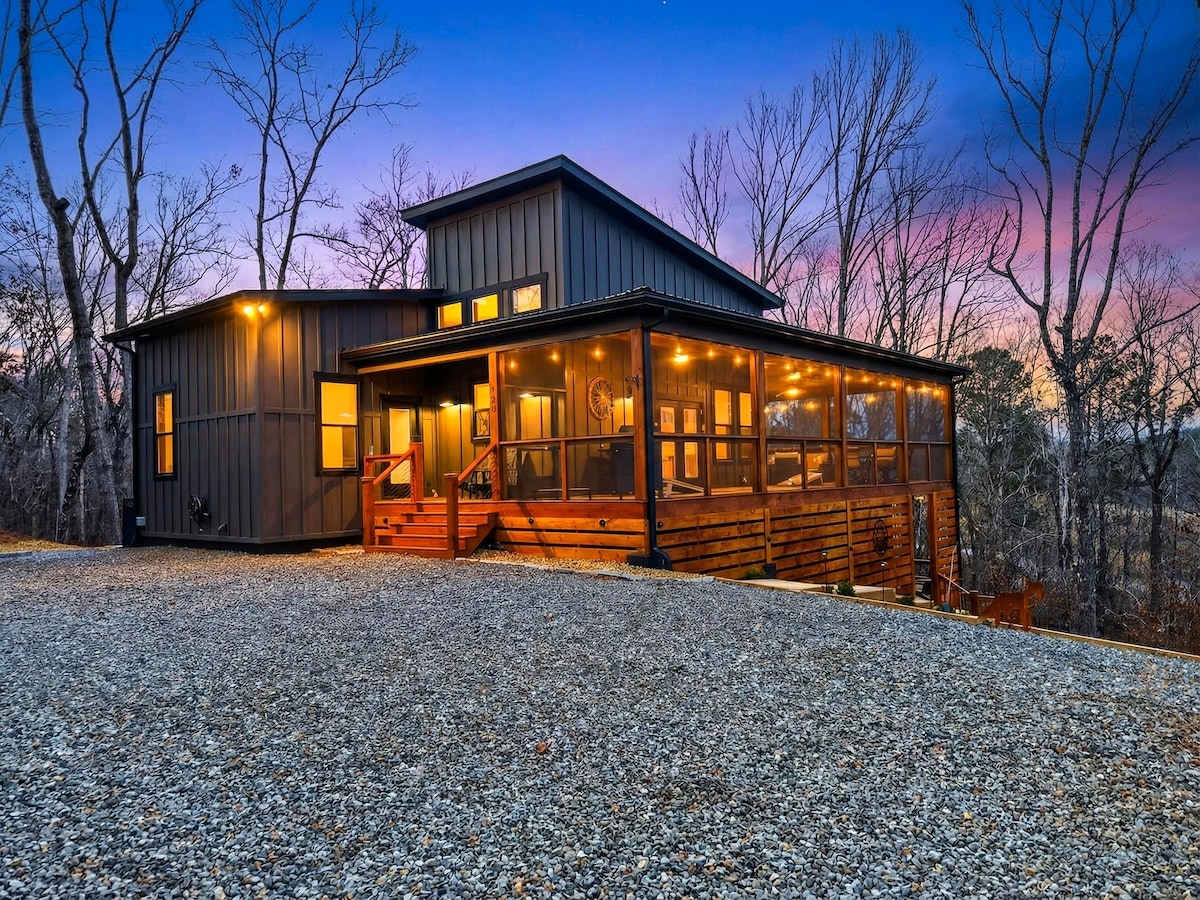Immerse yourself in nature at this Modern Mountain retreat. - Private Sauna & Hot Tub with Nature Views - Fire Pit with string lights - Spacious back deck with outdoor dining, fireplace, and 60" TV - Gas Grill - 2 King Beds + 1 Queen Bed - Egg chair and swinging bed on Front Porch - 5 minutes to Carters Lake - boat ramp access within 1.5 miles - 5 minutes to Tumbling Waters Hiking Trail - 15 minutes to Ellijay - 35 minutes to Blue Ridge - 45 minutes to Amicalola Falls