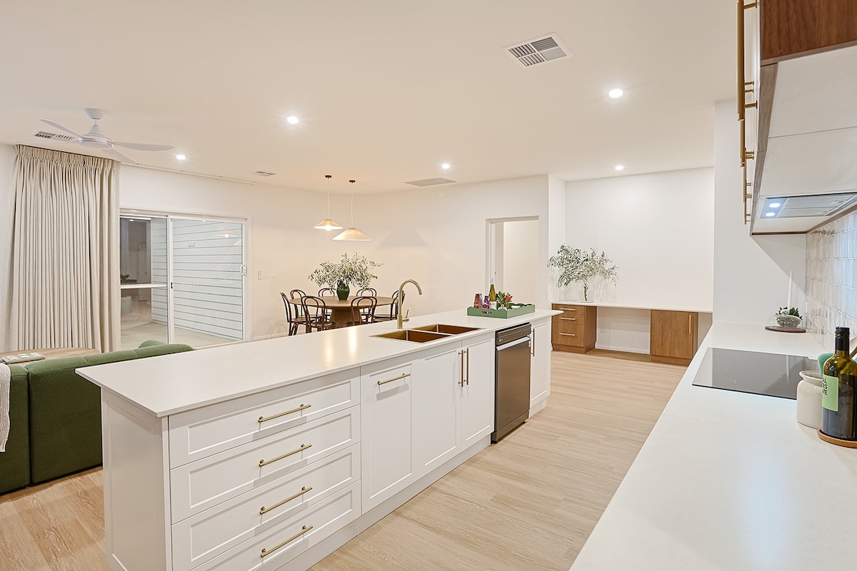Peaceful central location on a no through road and situated directly opposite a beautiful park with large open grass areas. The house has been restored to preserve its mid century charm with modern features included New split system aircon in each bedroom & living-kitchen area. 55 inch smart tv, cook top, oven, fridge, microwave, washing machine, dish washer, coffee machine & furnishings. Unlimited wifi. Easy walk to CBD, Murray River, tourism, pool, library, hospitals & golf