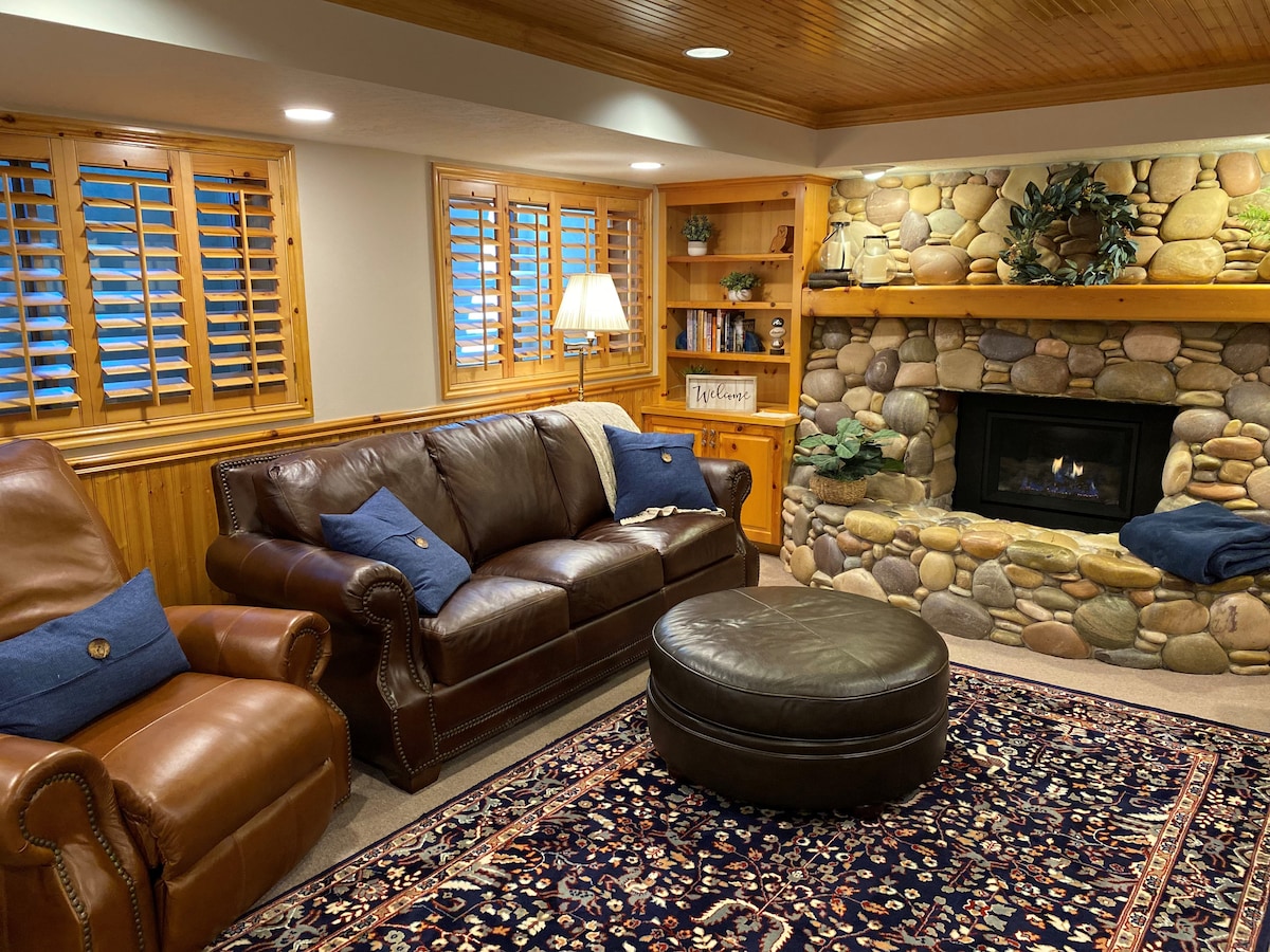 Unwind at this spacious 1,200+ sq. ft, cozy, cabin-like retreat minutes from world-class skiing and hiking. Less than 10 minutes from Little and Big Cottonwood Canyons, this is your perfect home base. Enjoy a new full kitchen, warm gas fireplace, large smart TV, super-fast Wi-Fi, desk, plush king, queen and full beds, luxury linens, washer/dryer, and large backyard. Private entry and off-street parking. Living rm. has a 4K HDR TV w/ most smart TV features, Roku, Amazon, YouTube, Netflix, etc.