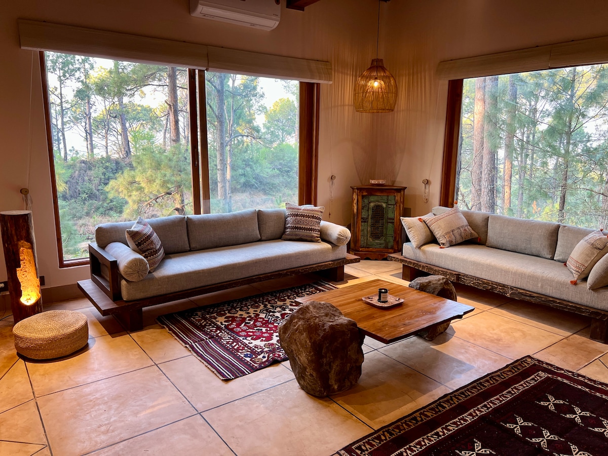 Welcome to your luxurious 2BR retreat in Murree! • 🌄 Panoramic Views & Ethnic Sunroom • 📍 Each and Every Major Attraction, Café & Restaurant Within 10 Mins • 🍽 Fully Equipped Kitchen • 🛏 Elegant Bedrooms, Cozy Lounge • 🚗 Main Road Access & Gated Parking • ❄ Snow Cleared Every 15 Mins, Snow Chains Available • 👨💼 Dedicated 24/7 Caretaker • 🥐 In House Chef • ☕ Subway, Dunkin’ Donuts at walking distance • 📐 Sprawling 2,800 sqft with only 2 bedrooms — exceptionally spacious