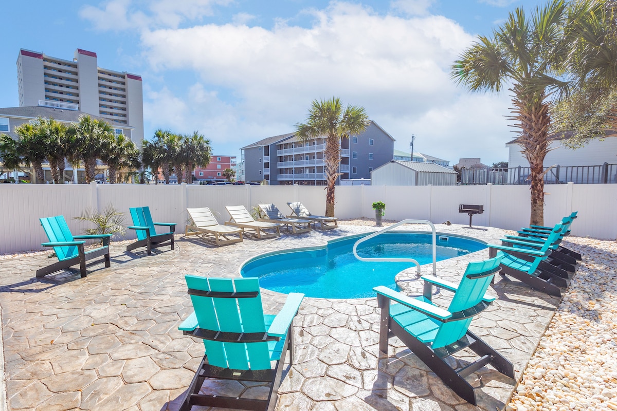 Hoping to escape on a beach retreat? Look no further than this 4-bedroom, 4.5-bathroom vacation rental condo in Murrells Inlet! The property features a gated PRIVATE pool, with both a propane BBQ and charcoal BBQ for guests to use and enclosed firepit area, with an outdoor picnic table. An open-concept interior with bright spaces and nautical decor. FOUR balconies with outdoor seating, and it is just 1 BLOCK FROM THE BEACH! Close access to shopping and restaurants.