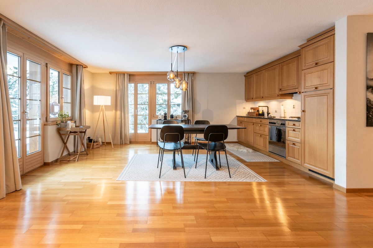 This new chalet is perched above the car free village of MURREN in the Bernese Oberland outside charming Interlaken. The apartment is the lower floor of the chalet with a spacious living/dining room and large windows that look across the spectacular Lauterbrunnen Valley with its 72 waterfalls to the North Face of the Eiger and the Jungfrau Massif. It offers the best view of any chalet rental in Murren. The Master Bedroom has a king bed and 2 walk in closets leading to the bathroom with shower and tub. On the edge of the living room is a queen wall bed, so the apartment comfortably sleeps 4 . The fully equipped modern kitchen has granite counter tops, dishwasher, 4 burner stove and oven. The fridge has a freezer. There is a bar with bar stools. The chalet has a wood burning stove and radiant floor heating. In the winter, guests can walk 8-10 minutes to the Allmendhubelbahn or 2 minutes to the BLM station for a quick train ride to the quad lift at Winteregg. We offer you free ski lockers and boot warmers.. You will love this space in the typical charming Swiss village of Murren. We're adjacent to a wildlife preserve, with occasional sightings of graceful charming Chamois, so we cannot accommodate dogs or cats. If you want spacious, quiet, private, cozy and spectacular, this place is for you. World famous hiking and skiing are at the doorstep. And a Peace you've never before experienced. After you check in, you'll be welcomed by our wonderful Property Manager Liza who will help you fill out the Kurtaxe form. While we pay the Kurtaxe for you, you need the filled out form in order to pick up the "Kurkarte" ID card at the Sports Center. With this card you can enjoy the free indoor swimming pool/hot tub plus free ice-skating in the winter. You can also benefit from discounts at various stores.