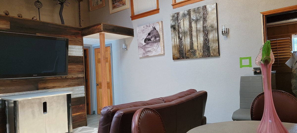 Unique farmstay, 3-room space, our largest one bedroom also has a Full pull out sofa in the same living area as the bed and working fireplace. Stunning whole room mosaic in the bathroom. First floor of the original two-story, three-unit farmhouse. No shared spaces. Two person hottub, private garden with small dining table, and lounge chairs to enjoy the treed view. Decent wifi.
