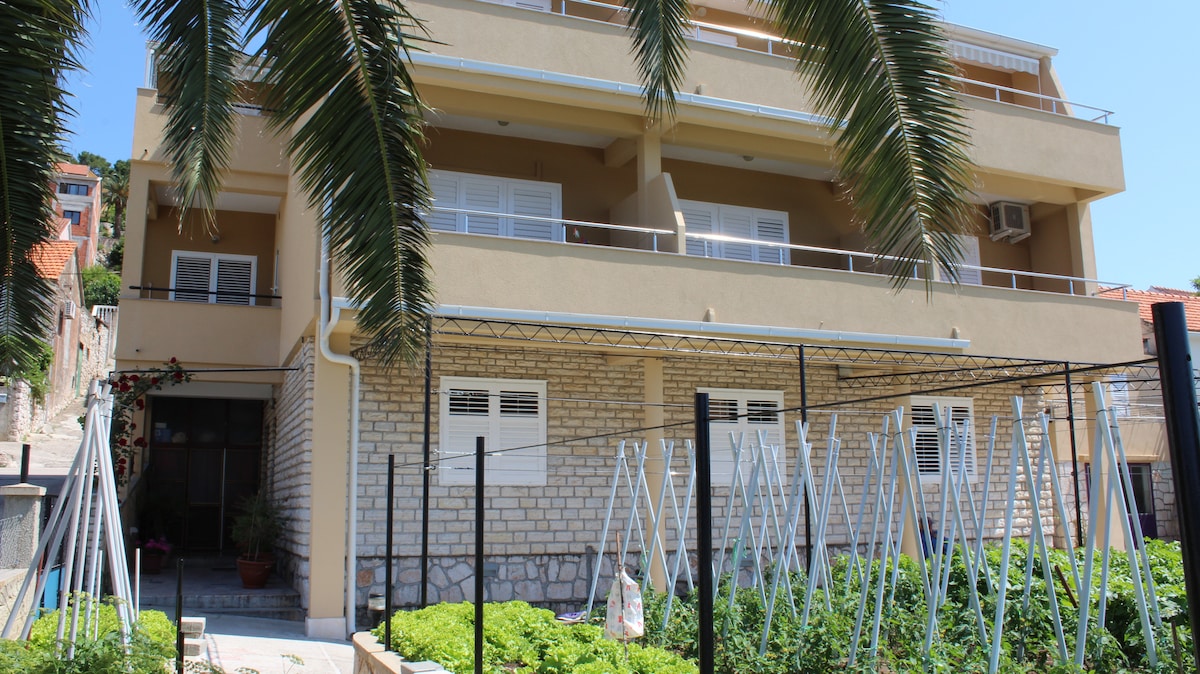 Apartman se nalazi u obnovljenoj tradicionalnoj kući samo nekoliko koraka od mora (5m) i oko 100-150 m od centra grada gdje ćete pronaći trgovine, restorane, ljekarne i još mnogo toga. Gostima je na raspolaganju cijeli prekrasan apartman s dvije spavaće sobe, potpuno opremljenim dnevnim boravkom i dijelom terase. Terasa je privatna za goste naše kuće koja sadrži još jedan apartman za dvije osobe. Na terasi se nalazi vez za brod. Svi troškovi su uključeni u cijenu, posteljina, ručnici, klima itd.
