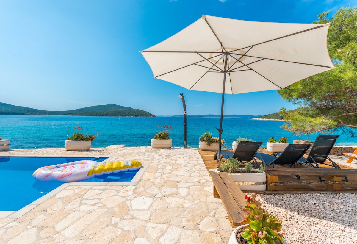 IMPORTANT: select your period - festival goers (thegardencroatia .com/events) or families. 1 night FREE for 14+ day stays Modern (2023) and stylish bungalow, with all the amenities and parking. Direct sea view from the spacious terrace tucked amidst olive and oak trees. Secluded beach, at a bay on the brink of the Kornati islands. Peaceful and quiet area, perfect for groups who want to relax and unwind. Nearby attractions by car. Perfect for groups of 4, with 2 bedrooms and bathrooms.