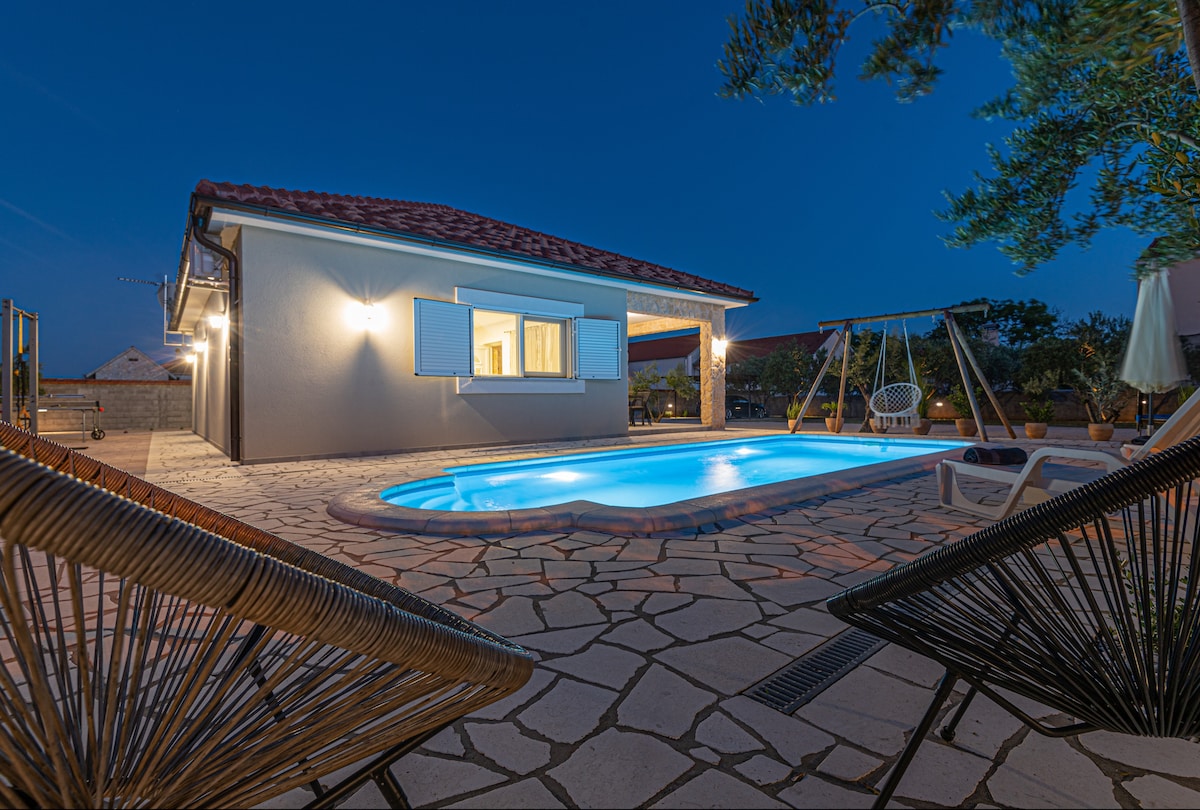 Beautiful, intimate house ideal for holidays with family or friends. We are located in a quiet place Čista Velika, only 10 km from the sea and the town of Vodice,Šibenik. The house has a capacity of 6 persons. We offer 3 rooms, of which 2 rooms with a double bed and their own toilet and 1 room with a bunk bed. There is a large living room, kitchen and outdoor pool The house has: Jacuzzi 0-24 Wi-fi Satellite Grill Darts Outdoor gym Table soccer Table tennis Trampoline Badmiton Pikado Parking