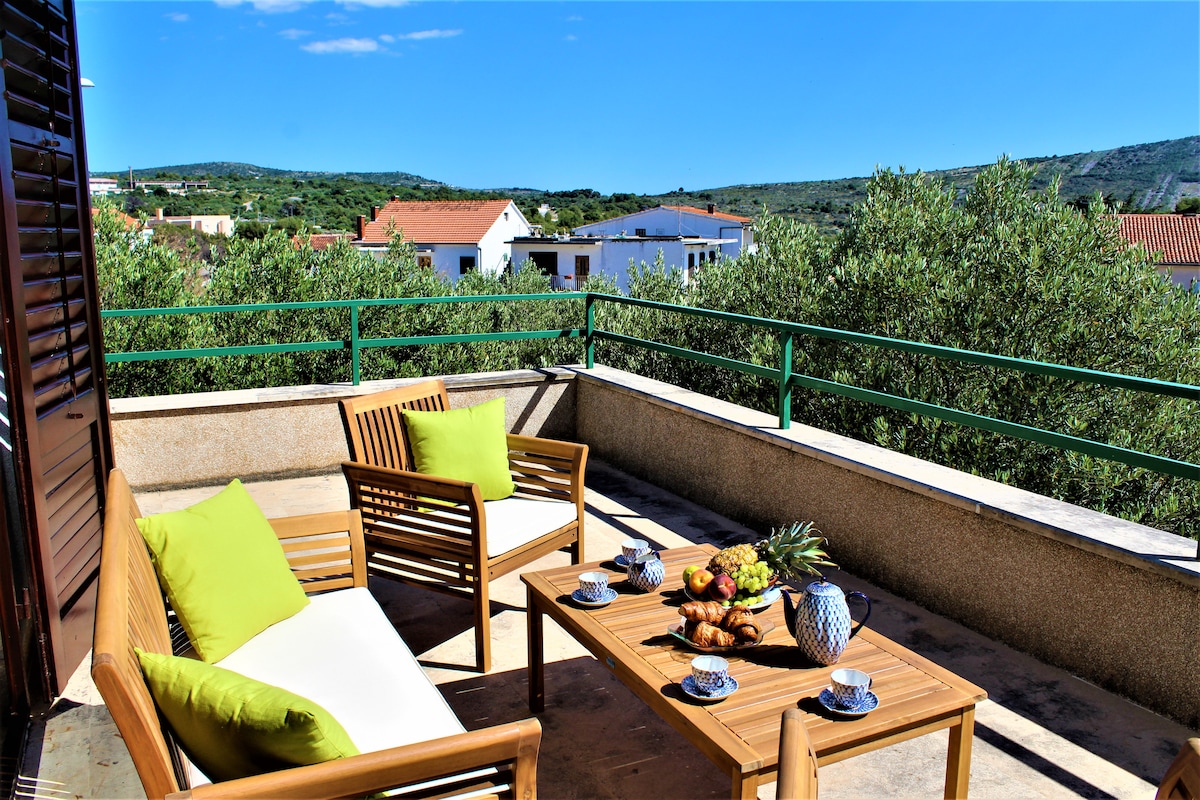 This one-of-a-kind arty apartment with a beautiful view over the setting sun and sea will relax and inspire you.It has high sealing,and a lot of natural light, you can sit on a terrace and enjoy a cup of tea or a glass of wine or play basketball on backyard court .It has TV,FREE Wi-Fi,AC,free parking, barbecue. There is a double bed for 2 per. in a bedroom and a sofa for 2 per. in the living room.It's 15 min. walk from the center and 2 min. from the sand beach Slanica - Great location.