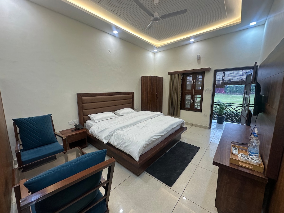 Luxury Getaway with Pool & Bonfire Enjoy a 2-bedroom retreat, each with an attached washroom for privacy and comfort. Relax in the spacious living room or take a dip in the private pool. Gather around the bonfire with outdoor seating for cozy evenings. The open area is perfect for hosting events, BBQs, or small celebrations. A stylish and serene escape, ideal for relaxation or special gatherings. Book now! Music timings -1pm to 10:30pm