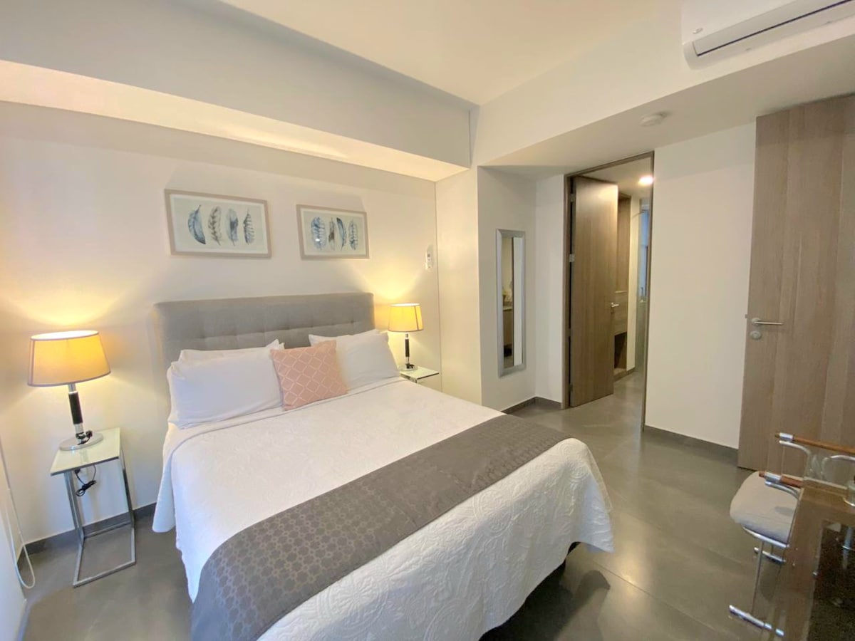 - Acogedor y exclusivo estudio ejecutivo con cama queen-size, escritorio y aire acondicionado. - Balcón para tomar aire fresco. - Cocina equipada. - Ingreso con cerradura inteligente y clave personalizada y exclusiva para cada huésped. - Rooftop panorámico con restaurante en el nivel 9. - Sala de juntas equipada para reuniones profesionales (consultar disponibilidad). - Acceso 24/7 con código personalizado. IMPORTANTE: No contamos con estacionamiento privado dentro de la propiedad.