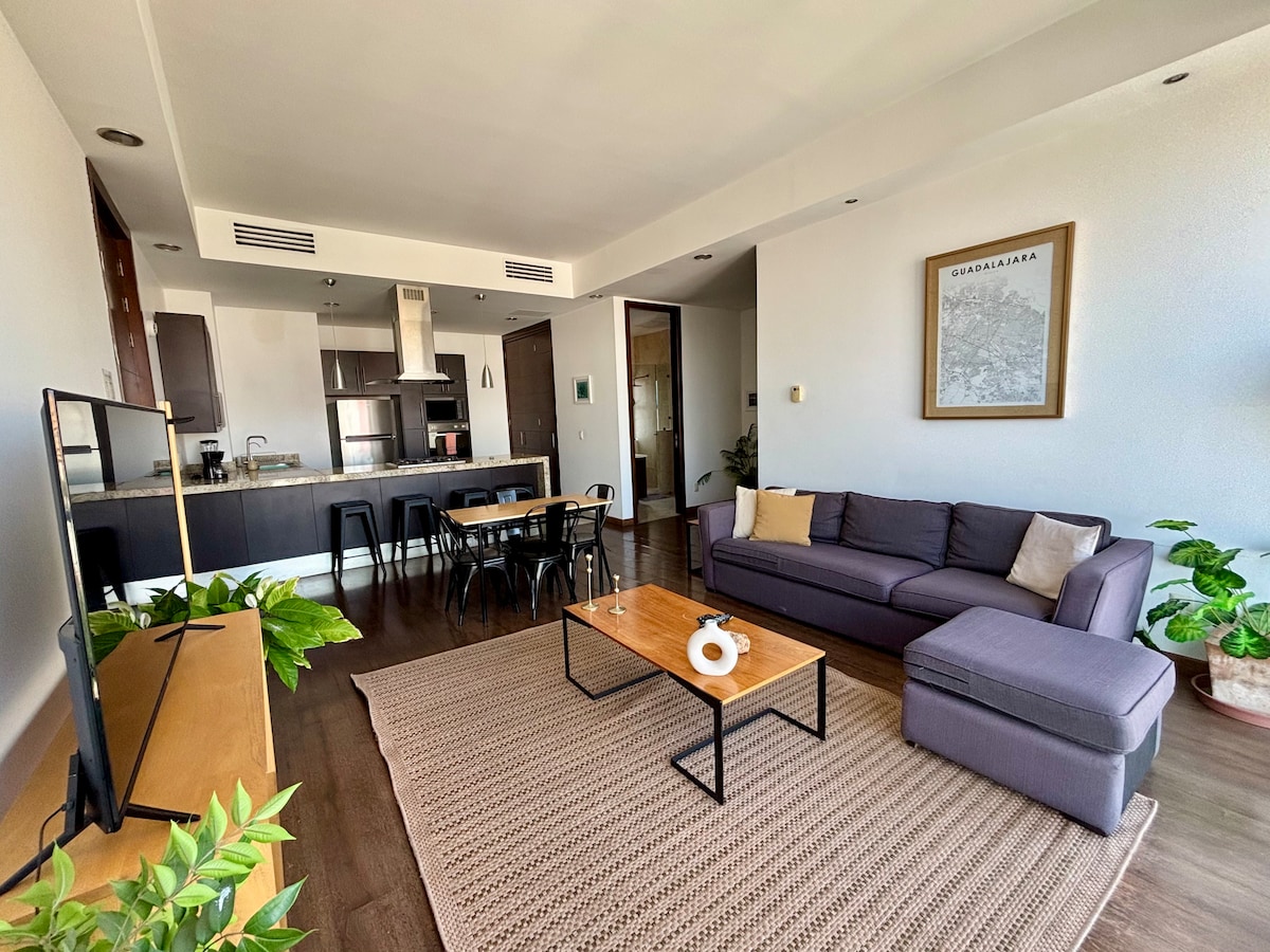 Vive la experiencia Tapatía en el corazón de la Ciudad! Disfruta una de las zonas más populares: La Colonia Americana, A sólo 2 calles del Templo Expiatorio, 8 minutos de Av. Chapultepec y 10 del Centro histórico. El departamento está diseñado para que disfrutes tu estancia! En la cocina encontrarán lo necesario para cuando se les antoje comer en casa, Saborea una Cerveza Fría o un Rico Vino en tu terraza privada y Descansa en una amplia cama tamaño Queen Size. Bienvenidos!