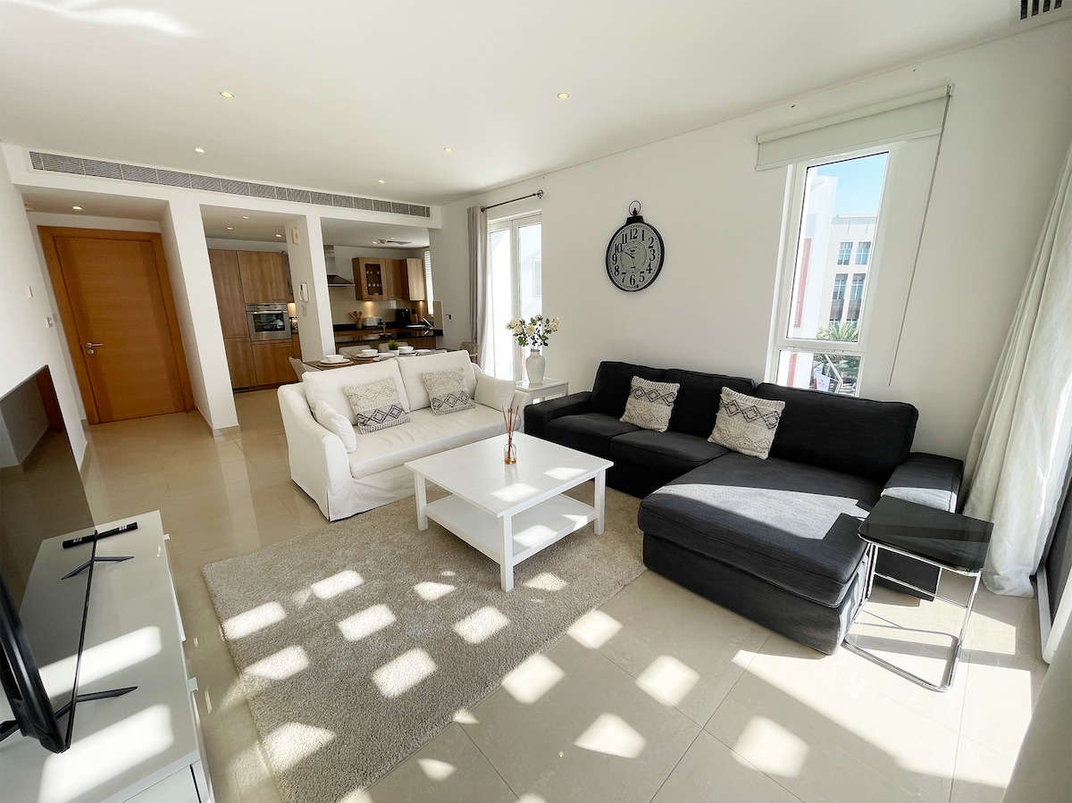 This modern stylish one-bedroom apartment is ideally situated on the Muscat Al Mouj, with breathtaking sea & pool view. ——The Space—— Quiet, clean and peaceful with new and modern furniture's make it perfect for relaxation and enjoyment. Swimming pools, Gym, Kids play area, access to the beach, marina, coffee shops and fine restaurants in and outdoor within the area. Relax fully with top-notch amenities (75” TV, high-speed WiFi, hotel-quality linens and towels,Coffee) right on your fingertips!