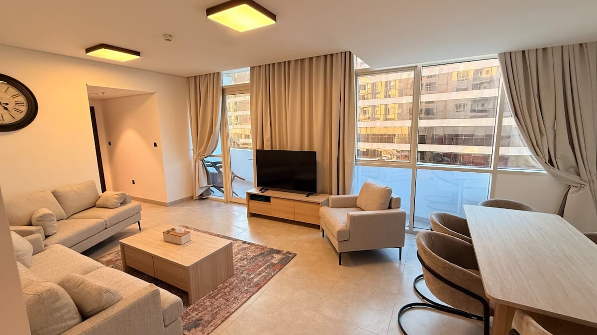 New 1 Bd flat with balcony, living area & 2 toilets.Nice furniture. Equipped with high speed WiFi, bed and dressing,sofa, 50 inch smart TV, satellite and free Netflix access, iron machine, hair dryer,vacuum cleaner, duct AC, ceiling with LED spot lights . You can enjoy the free swimming pool, gym & kids playground and BBQ cooking area. 5min drive from shopping malls, 15-20min from airport. 20min drive from beach, 20min drive from the old Market, next to sand dunes view.