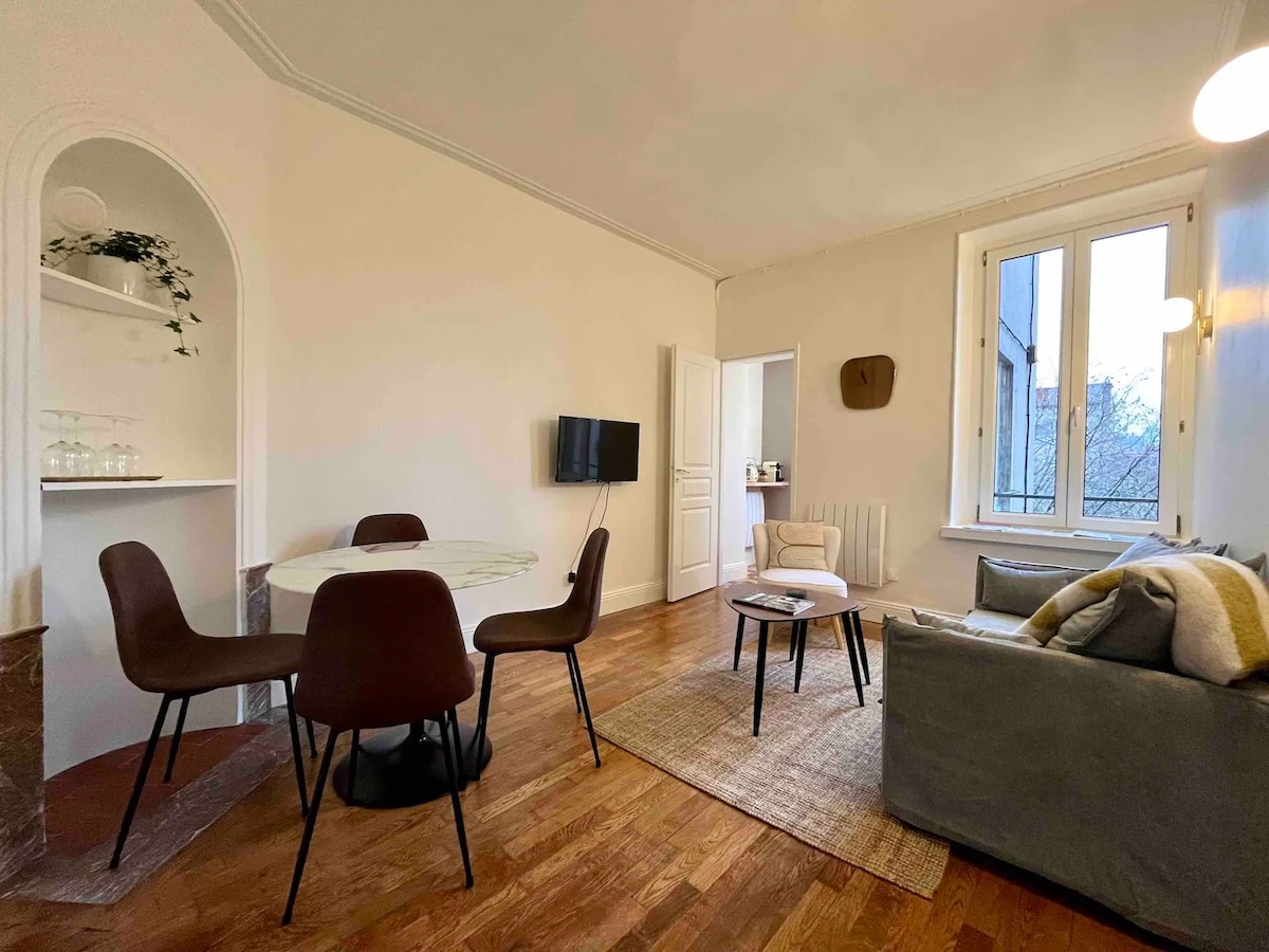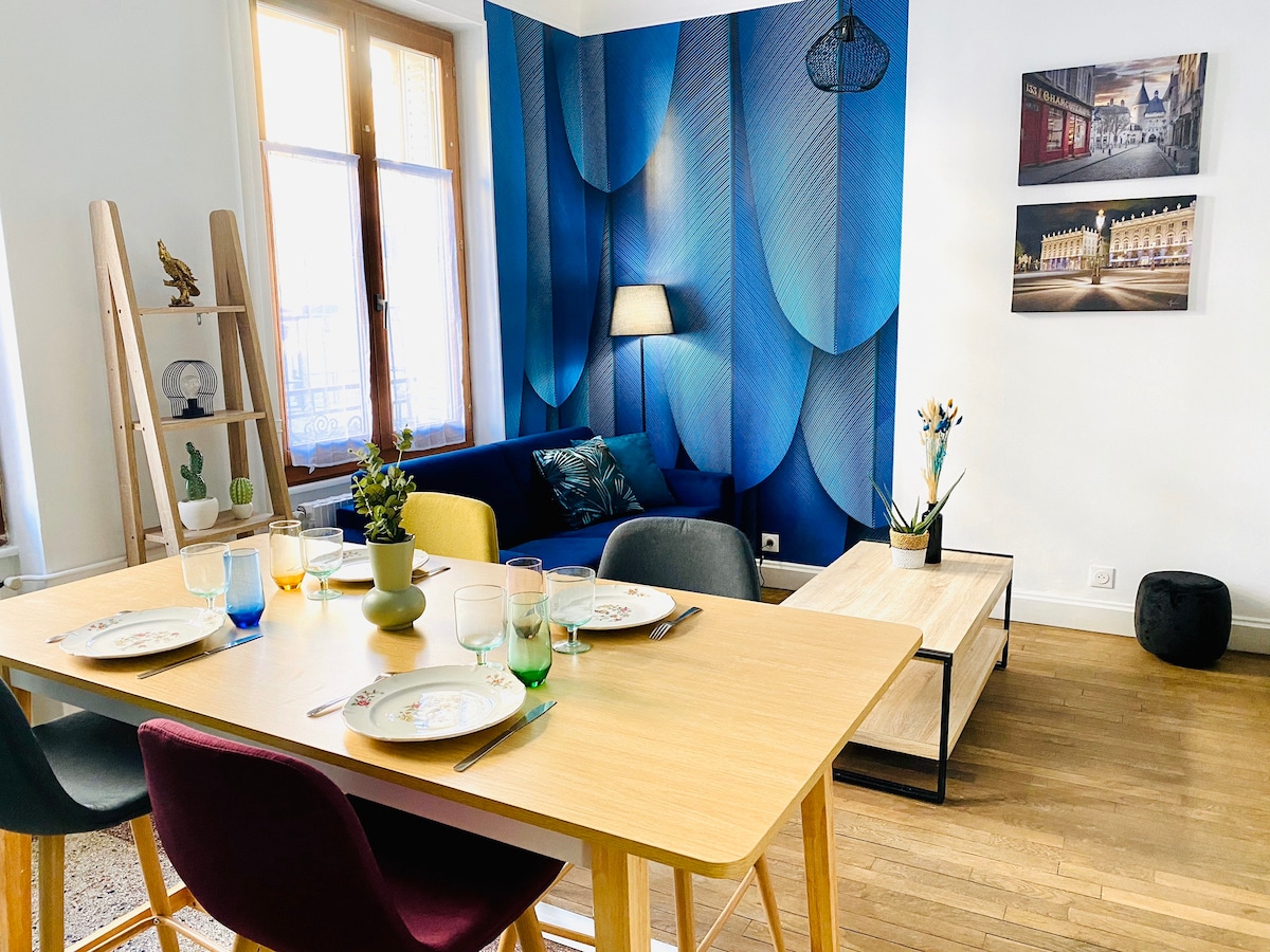 Pour votre séjour à Nancy, je vous propose un bel appartement de 45m² très calme, incroyablement lumineux et à 100m du parc Sainte Marie, tout équipé et très bien situé. Vous disposez d’un appartement avec : - une chambre climatisée de plus de 16m² intégrant un dressing et un coin bureau - une pièce de vie avec un espace salon, salle à manger et cuisine ouverte - une salle de bain =)