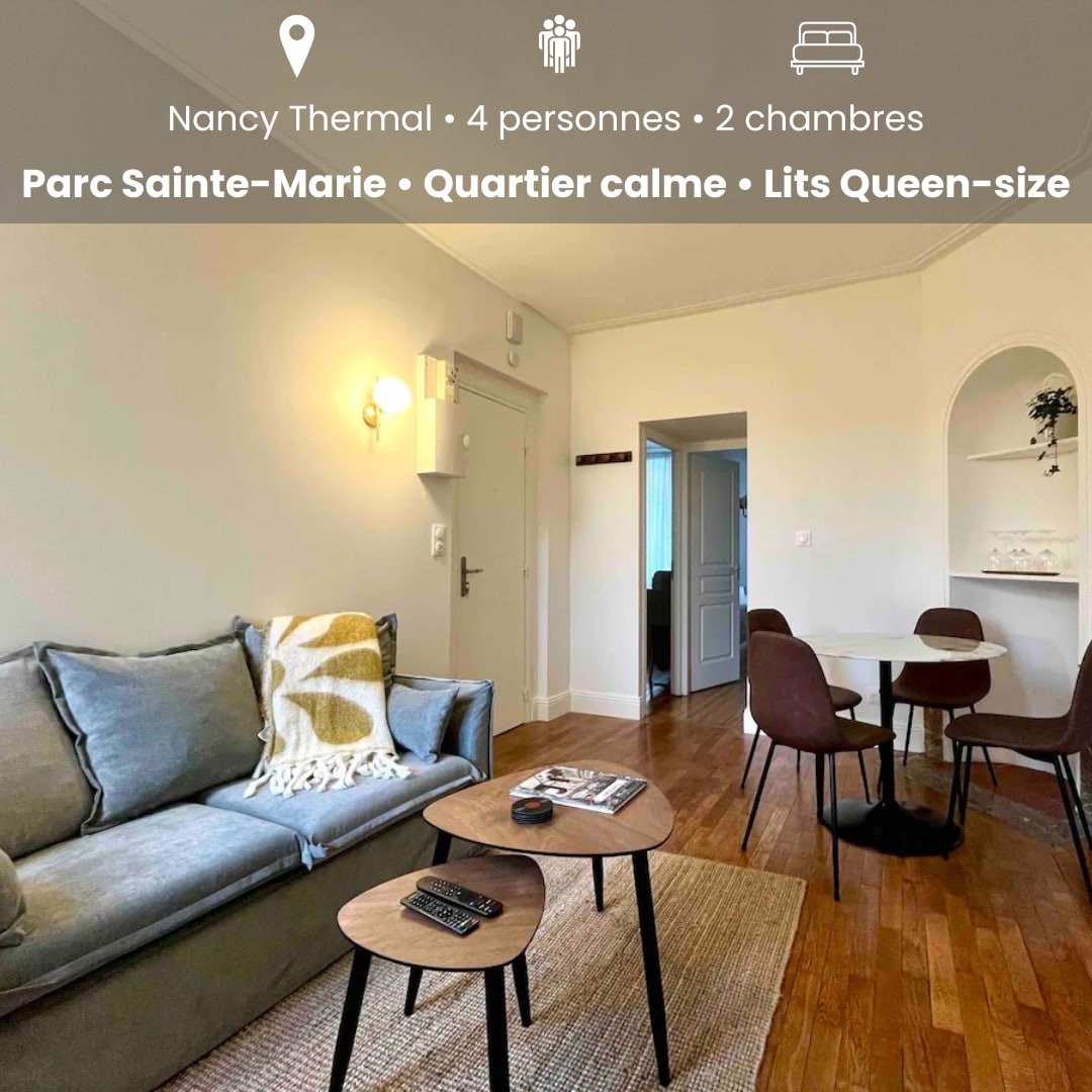 Appartement de 50m2 au 3ème étage. Le nouveau centre SPA Nancy Thermal est à 5 minutes à pied. Le très apprécié Parc Sainte Marie est à 1 minute à pied. Équipé, comme à l'hôtel, vous n'avez plus qu'à déposer vos bagages. Netflix, Prime, Wifi Important : Présence d'un capteur qui détecte les nuisances sonores et envoie des alertes. Ce capteur est légal et respecte la vie privée. Les fêtes sont donc interdites Profils avec commentaires ++ exigés pour acceptation