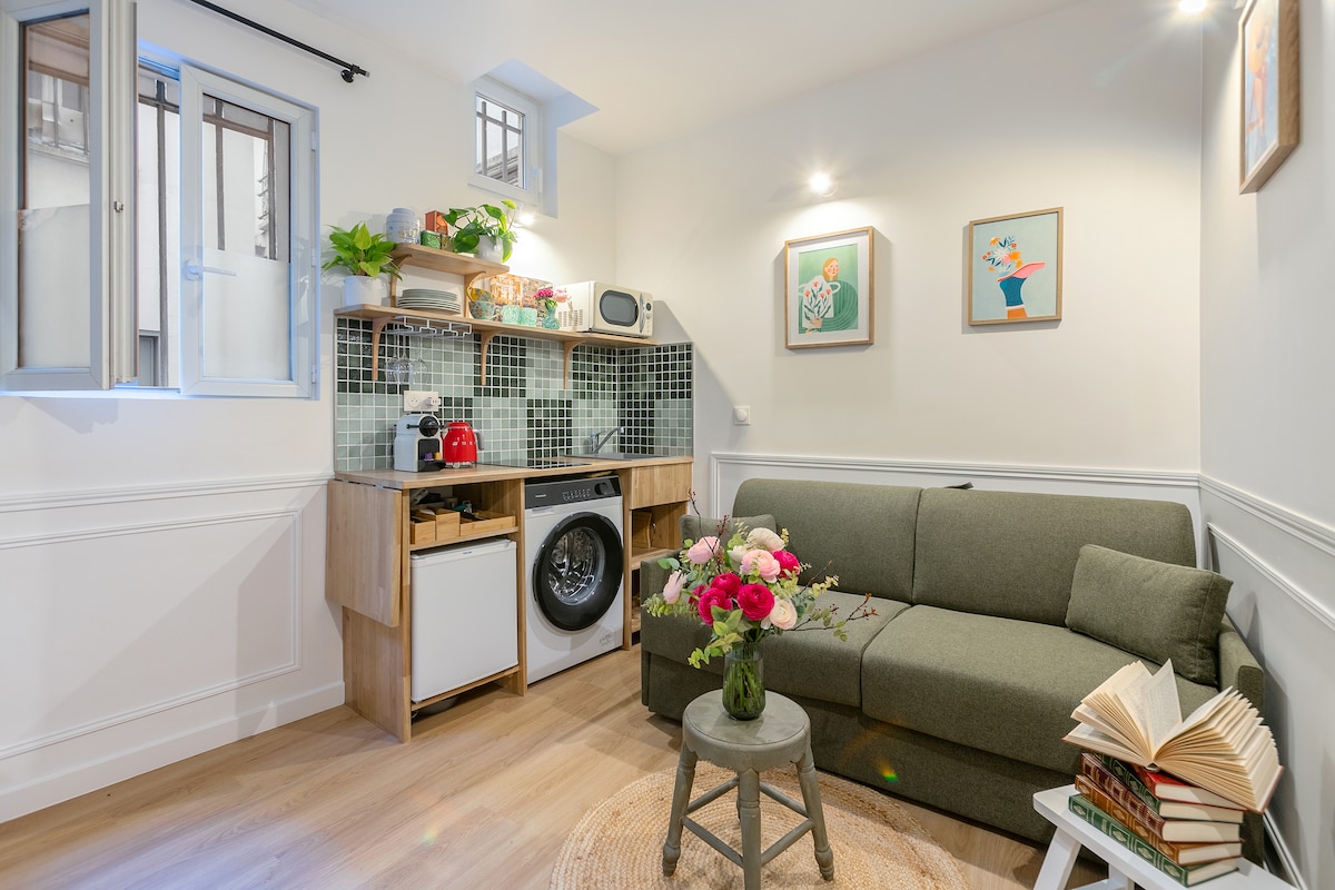 Charming, fully renovated and architect designed split level one-bedroom in the historical heart of Paris. Located in the central and trendy 2nd arrondissement. So peaceful ... enjoy your sleep. Short walk away from major spots in Paris Or hop on one of the five Metro lines available at hand. CHECK-IN FROM 2PM (earlier if no other guest is checking out the same day) - LUGGAGE DROP OFF AFTER 10AM Low ceiling on upper floor - not suitable for infants/toddlers (STAIRCASE) - read full description